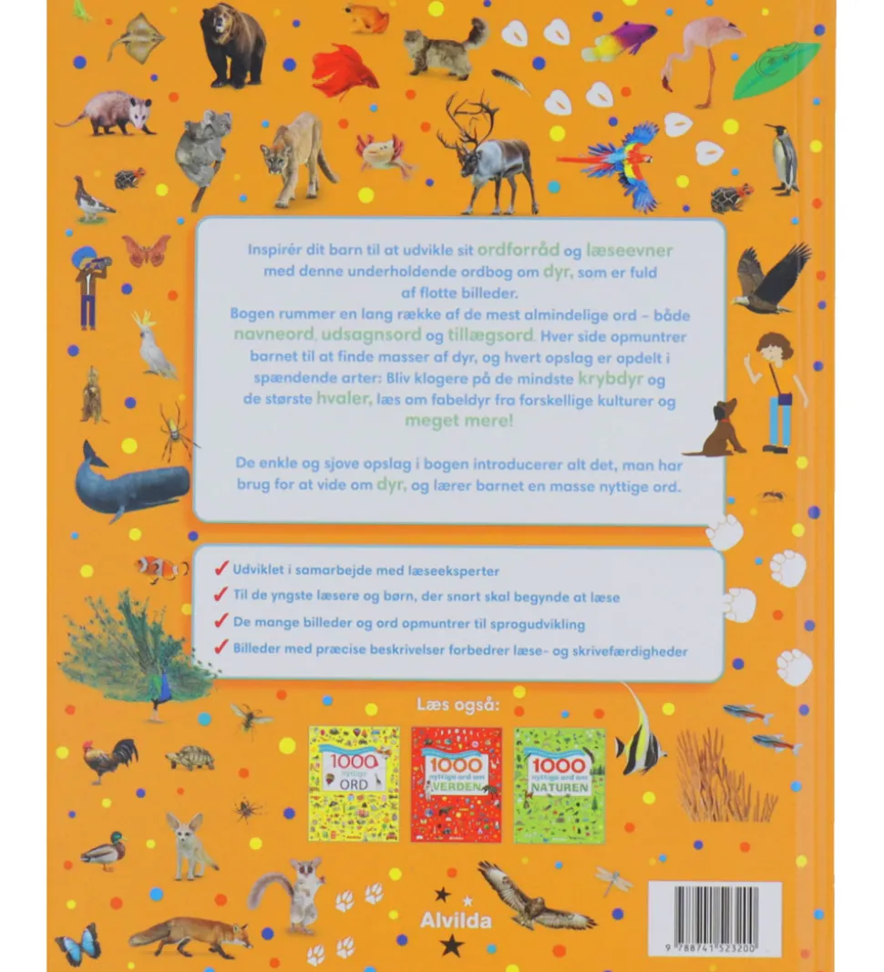 Lærerig Alvilda bog med titlen “1000 nyttige ord om dyr”.