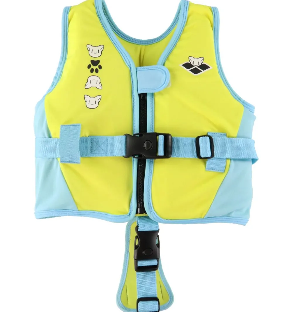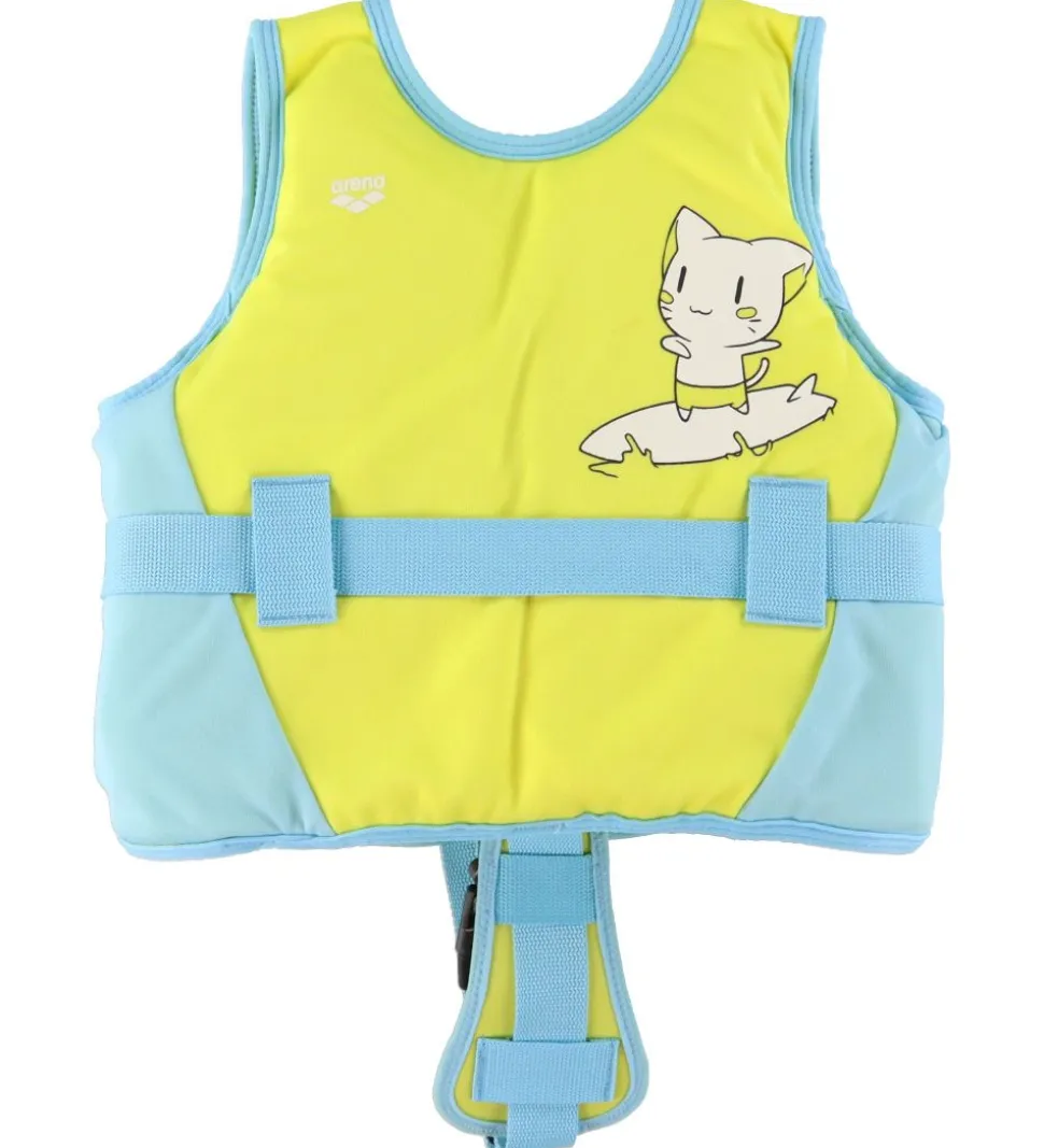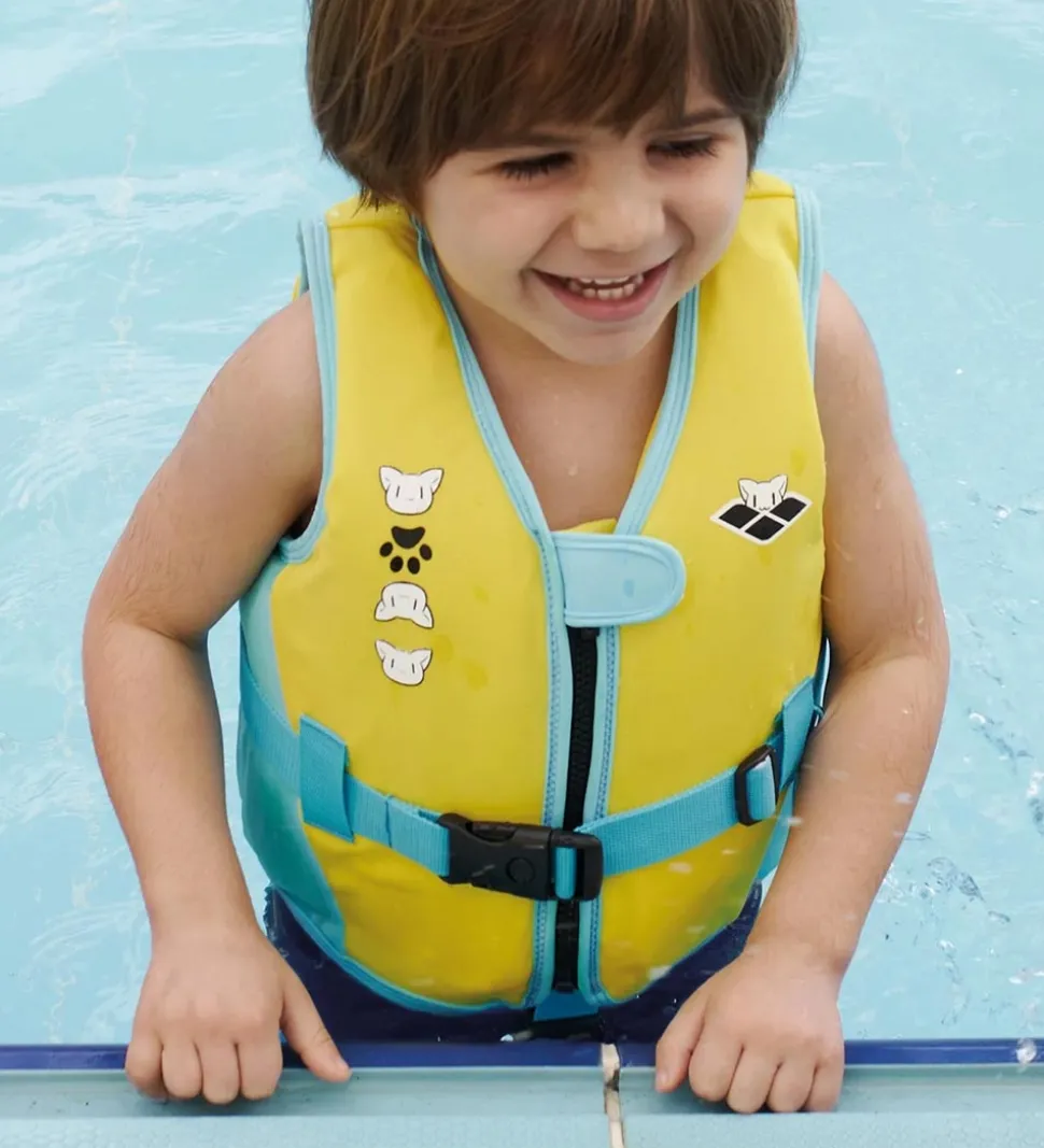 Sød Arena Friends svømmevest i gul med print af Arene Friends kattene samt logoet i sort og hvid. I kanten er vesten lysseblå.