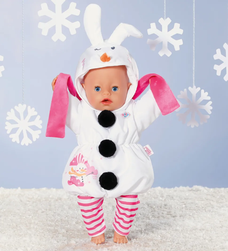 Skøn BABY born dukketøj med en hvid trøje udsmykket med sorte knapper og et fint kaninprint i pink. Sættet inkluderer desuden pink- og hvidstribede bukser og et matchende pink tørklæde.
