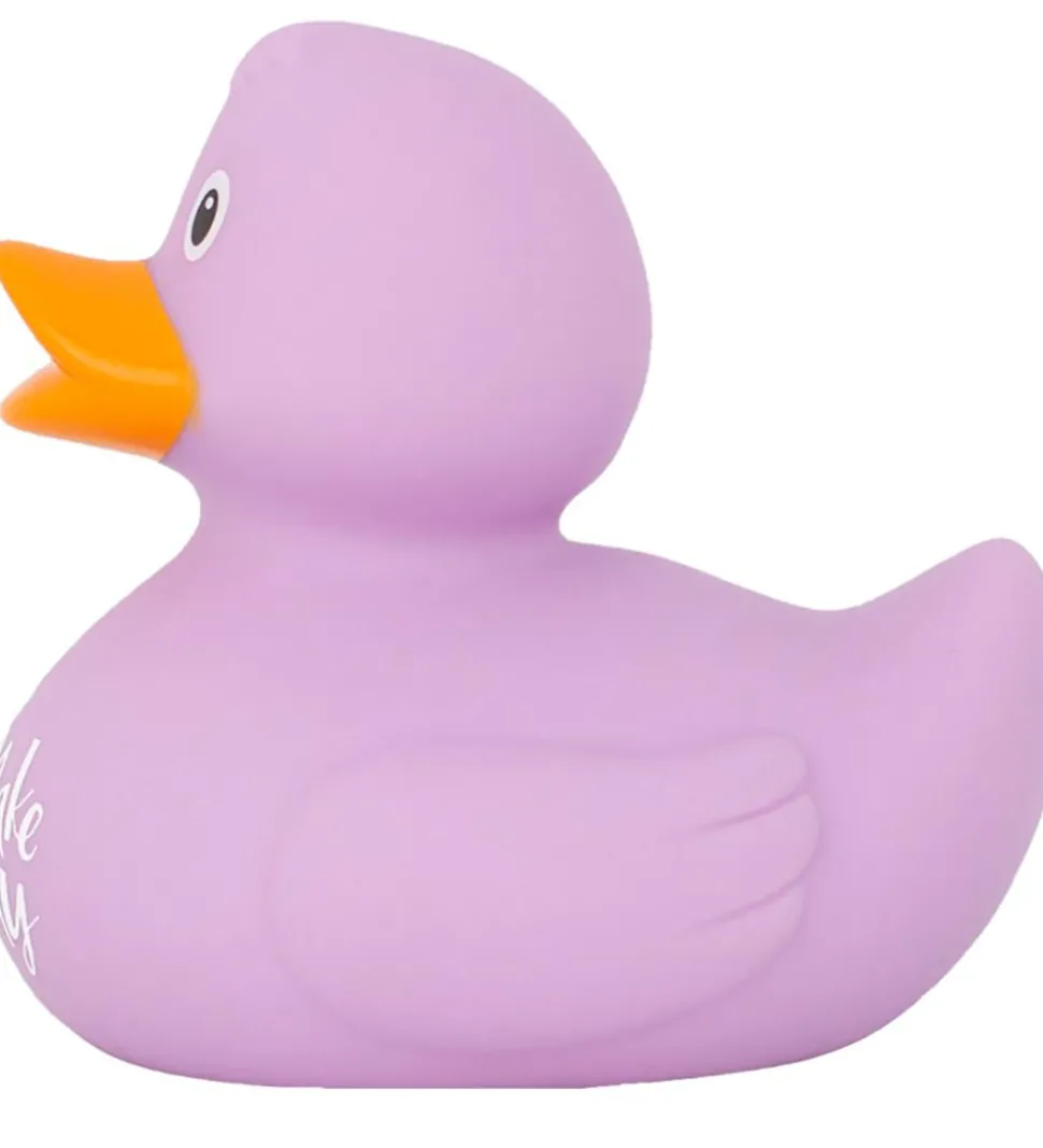 Sød badeand i lilla med teksten “You Make My Day” på fronten.