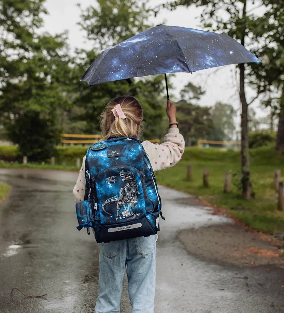 Smart Beckmann paraply i sort, blå og lilla nuancer med print af nattehimlen. Paraplyen er let at slå ud og i, og stangen har et rundt håndtag nederst med en strop, som kan tages omkring håndleddet. Når paraplyen pakkes sammen, kan skærmen holdes på plads med en praktisk rem med velcro.