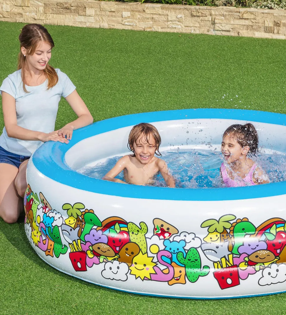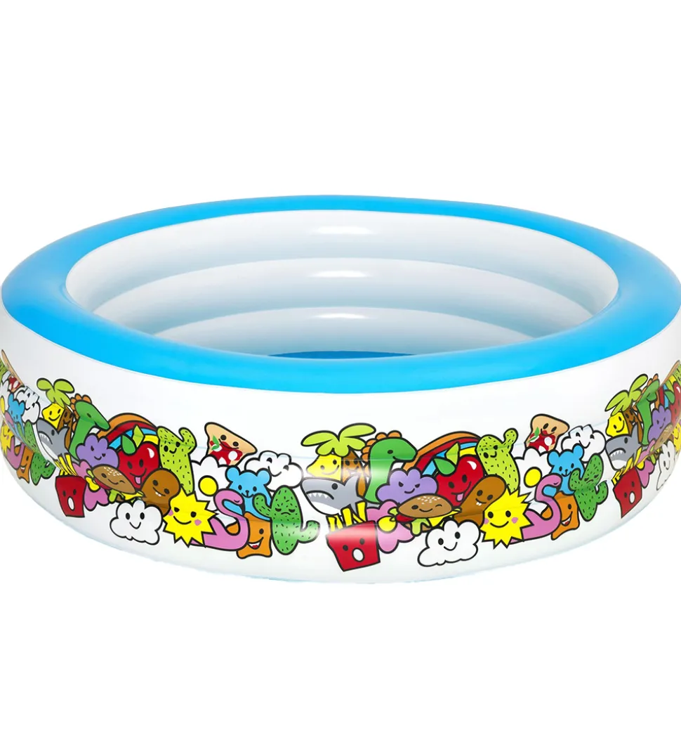 Fint Bestway badebassin i hvid med print af farverige figuer med ansigter på ydersiden og blå på indersiden.