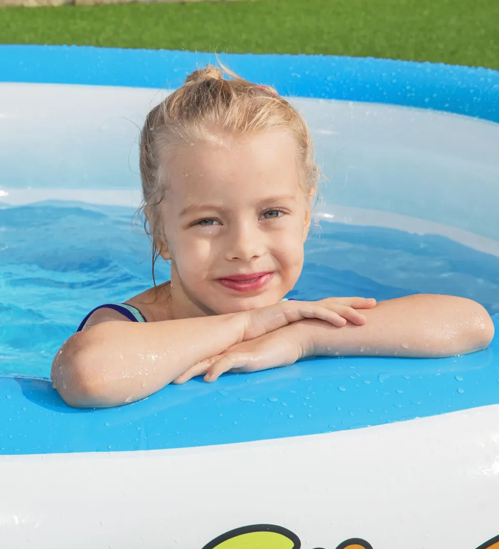 Bestway badebassinet er perfekt, når det er varmt udenfor, og der er brug for at blive kølet ned. Den er rund med tre ekstra brede, oppustelige ringe som sidevægge og pustes op med en ventil. Der er en aftømningsventil, som bruges, når badebassinet skal tømmes.
