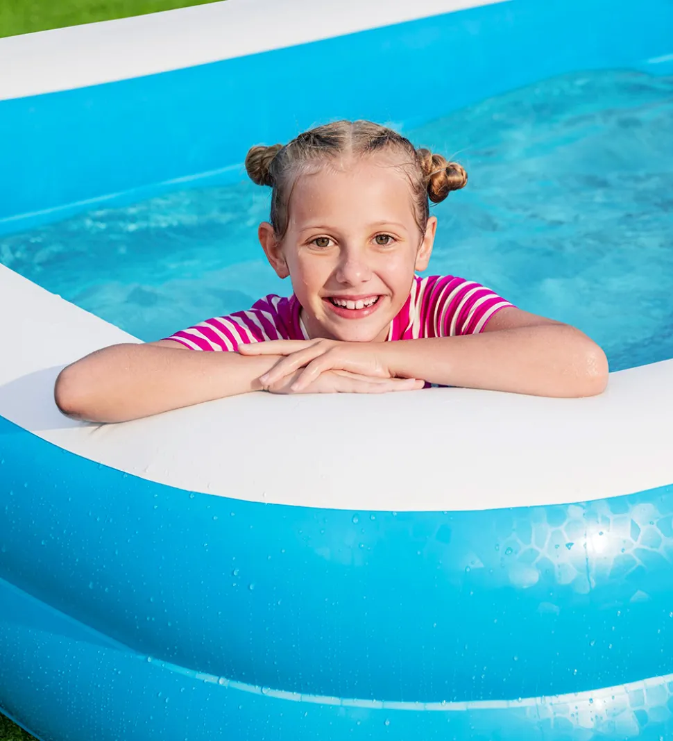 Bestway badebassinet er perfekt, når det er varmt udenfor, og der er brug for at blive kølet ned. Den er firkant og med to oppustelige ringe som sidevægge, der pustes op med to selvlukkende, hurtigtåbende ventiler. Når badebassinet skal tømmes, har den en smart afløbsventil.