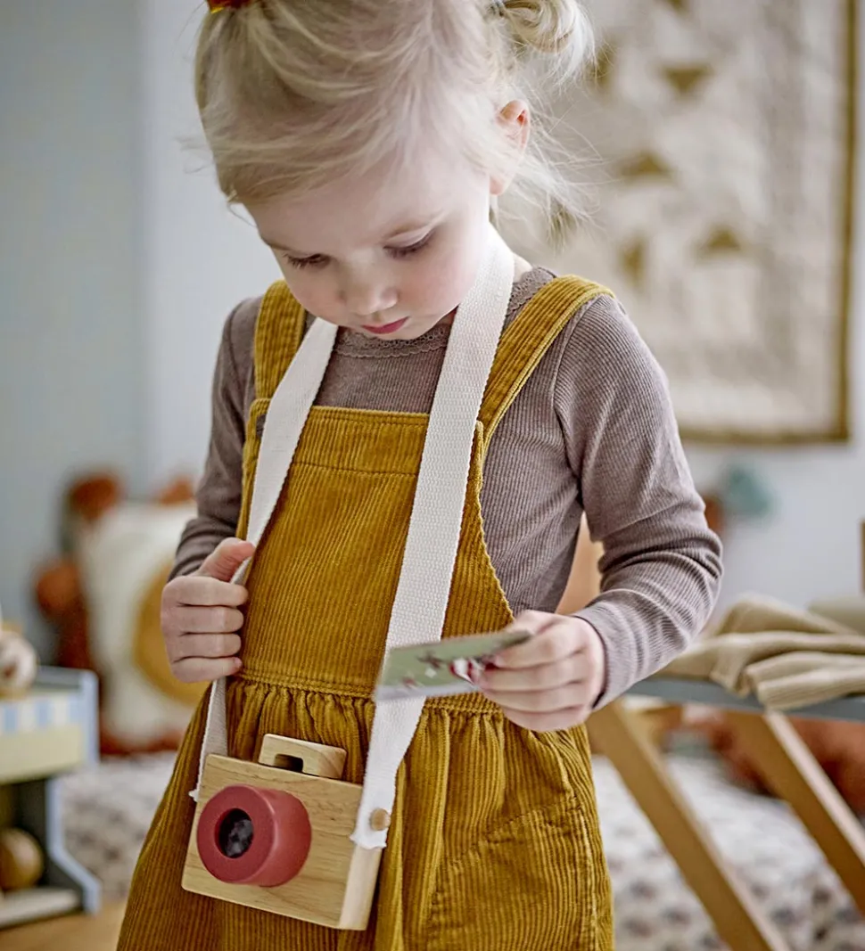 Sjovt Bloomingville Mini legetøjskamera i træ og med en hvid rem.