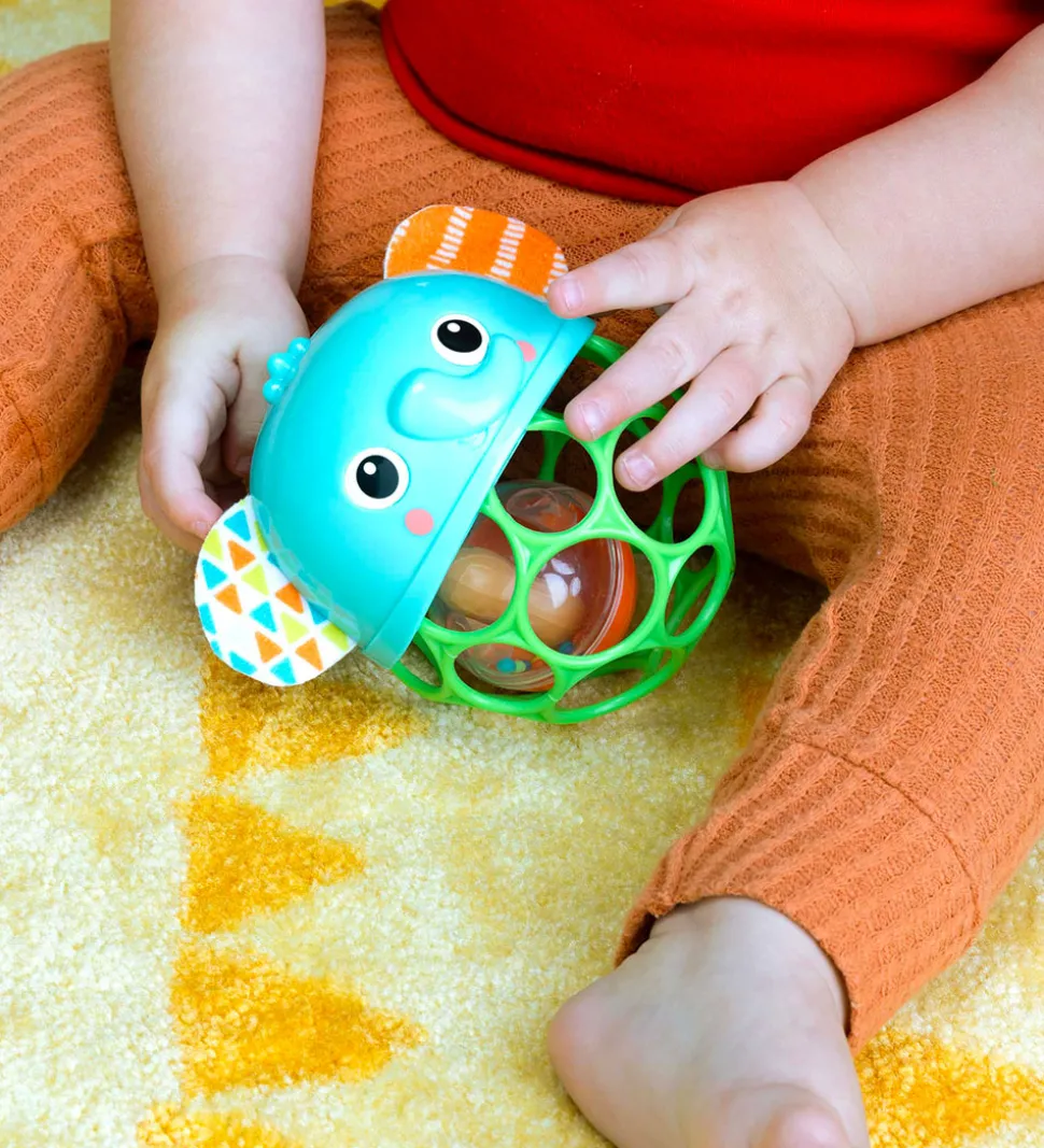 Bright Starts legetøjet er et sjovt rystelegetøj med sjove lyde og er lavet af fleksibel og holdbart Oball-teknologi som er nemt for baby at holde om. Legetøjet har masser af storer huller som gør det nemt for baby at gribe fat i. Indeni er en sjov bold med rasleperler indeni, som laver sjove lyde når den rystes, og som en ekstra detalje er elefantens ører lavet a tekstil som rynker når baby røre ved dem. Legetøjet har også en praktisk tænd- og slukknap.
