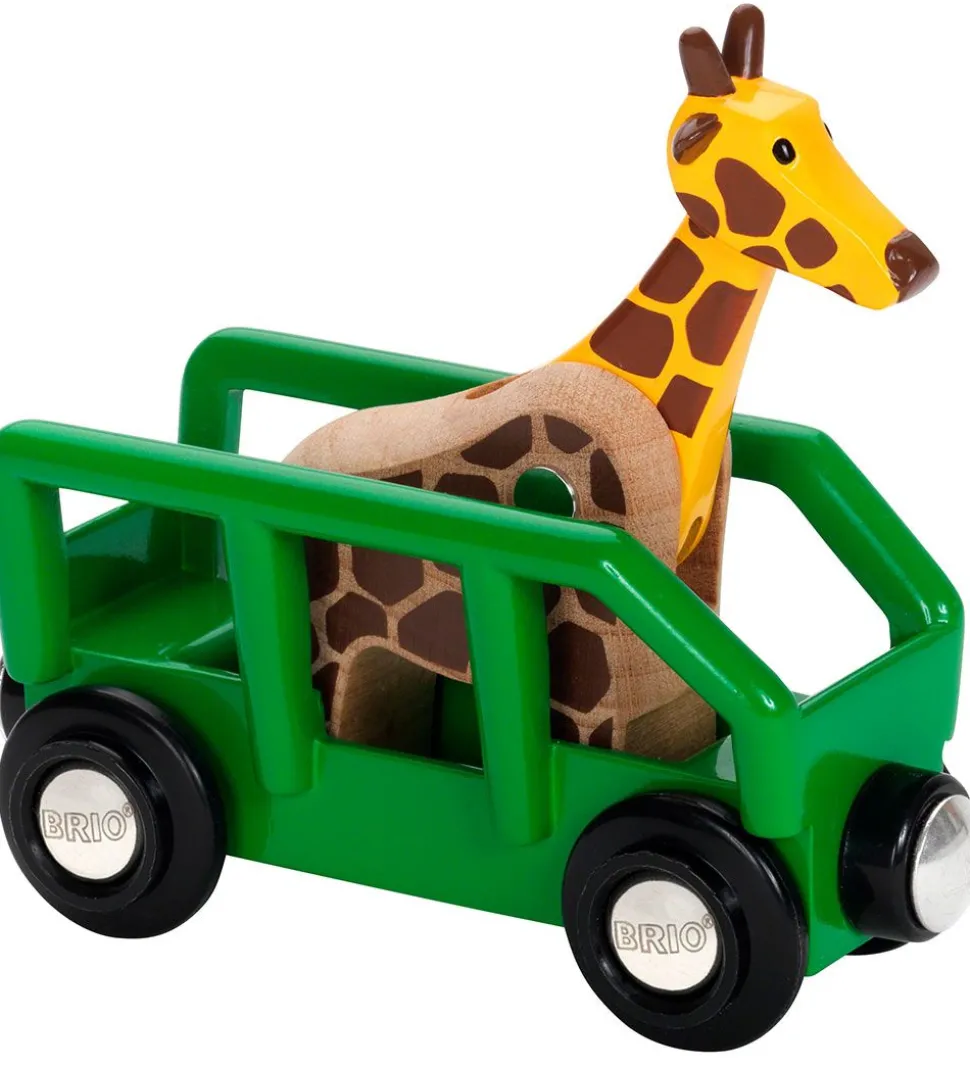 BRIO legetøjet er en sjov tilføjelse til legen med BRIO. Vognen har en magnet både fortil og bagpå, så den kan kobles på andre BRIO tog. Giraffen passer i vognen og kan bevæge halsen op og ned. Sættet lægger op til masser af gode og kreative stunder.