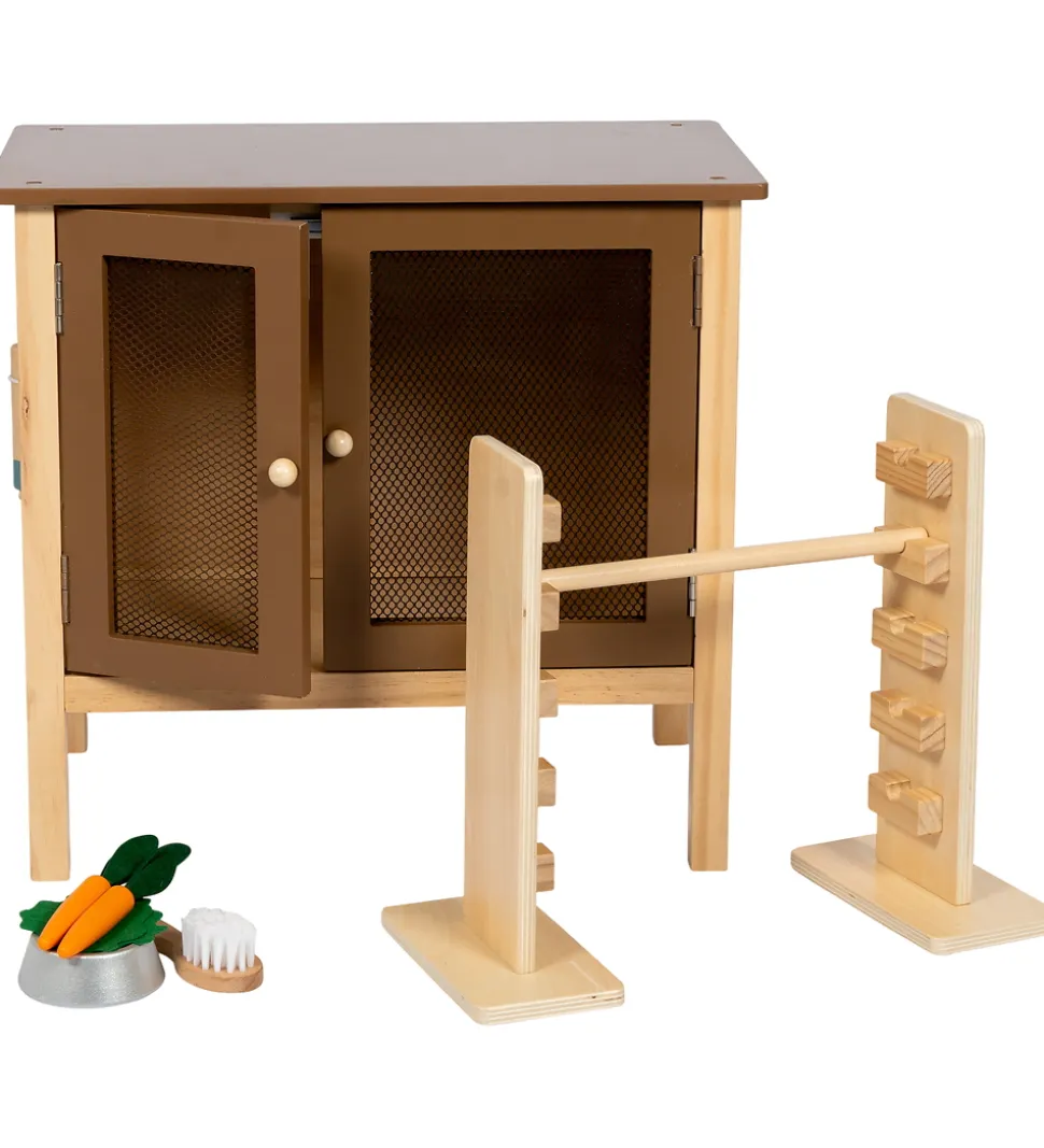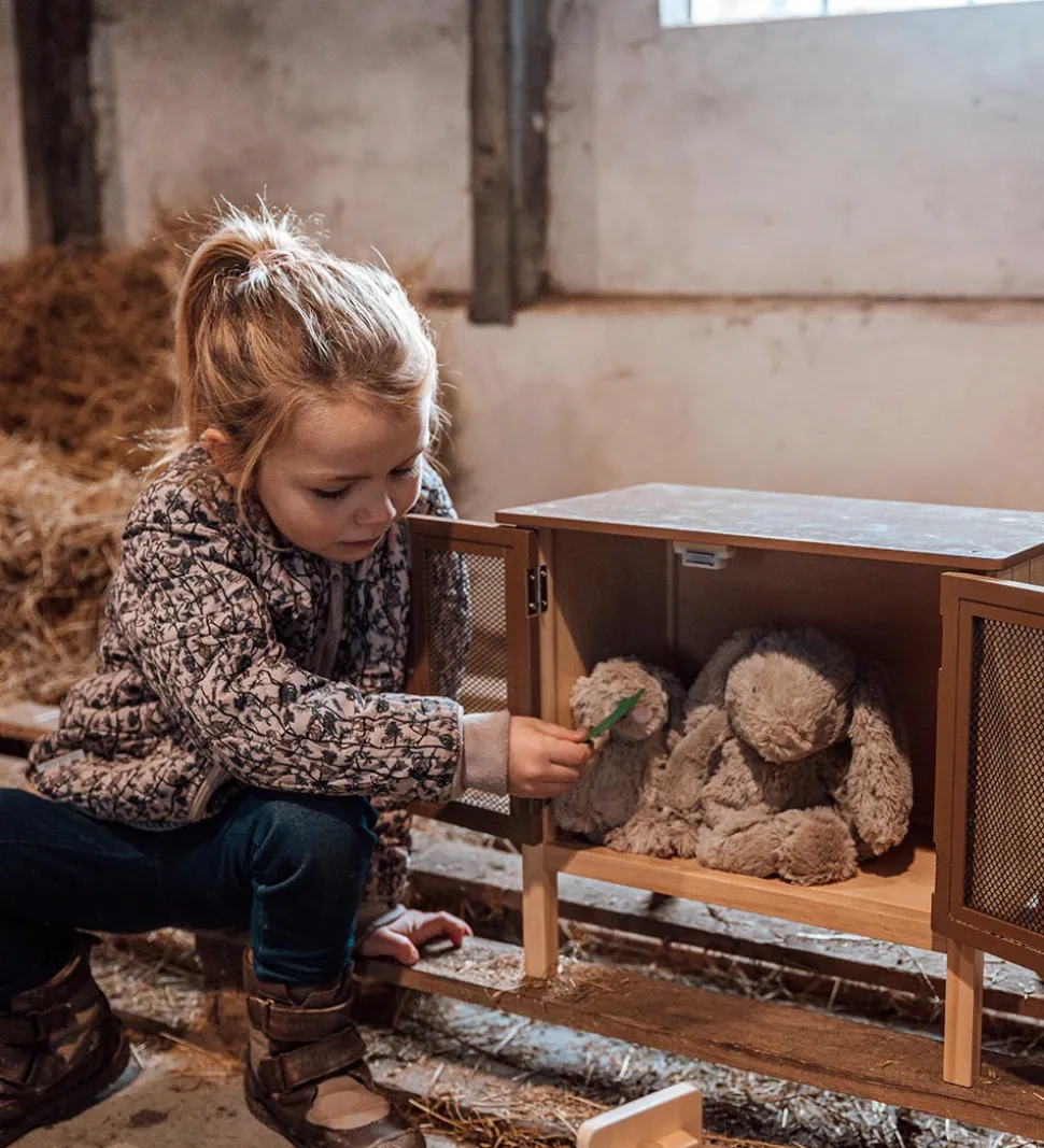 Med by ASTRUP kaninburet kan man lege med sin kaninbamse og lade som om, at man har en rigtig kanin som kæledyr, som skal have mad og vand. Med springforhindringen kan man lege, at man træner sin kanin til kaninhop-konkurrencer.