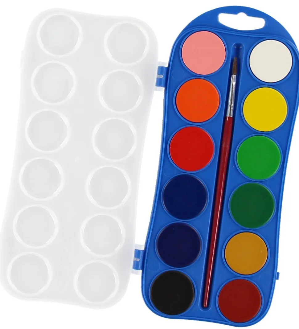 Underholdende akvarelmaling af Carioca bestående af 12 flotte farver og en pensel, i en praktisk kasse med låg.