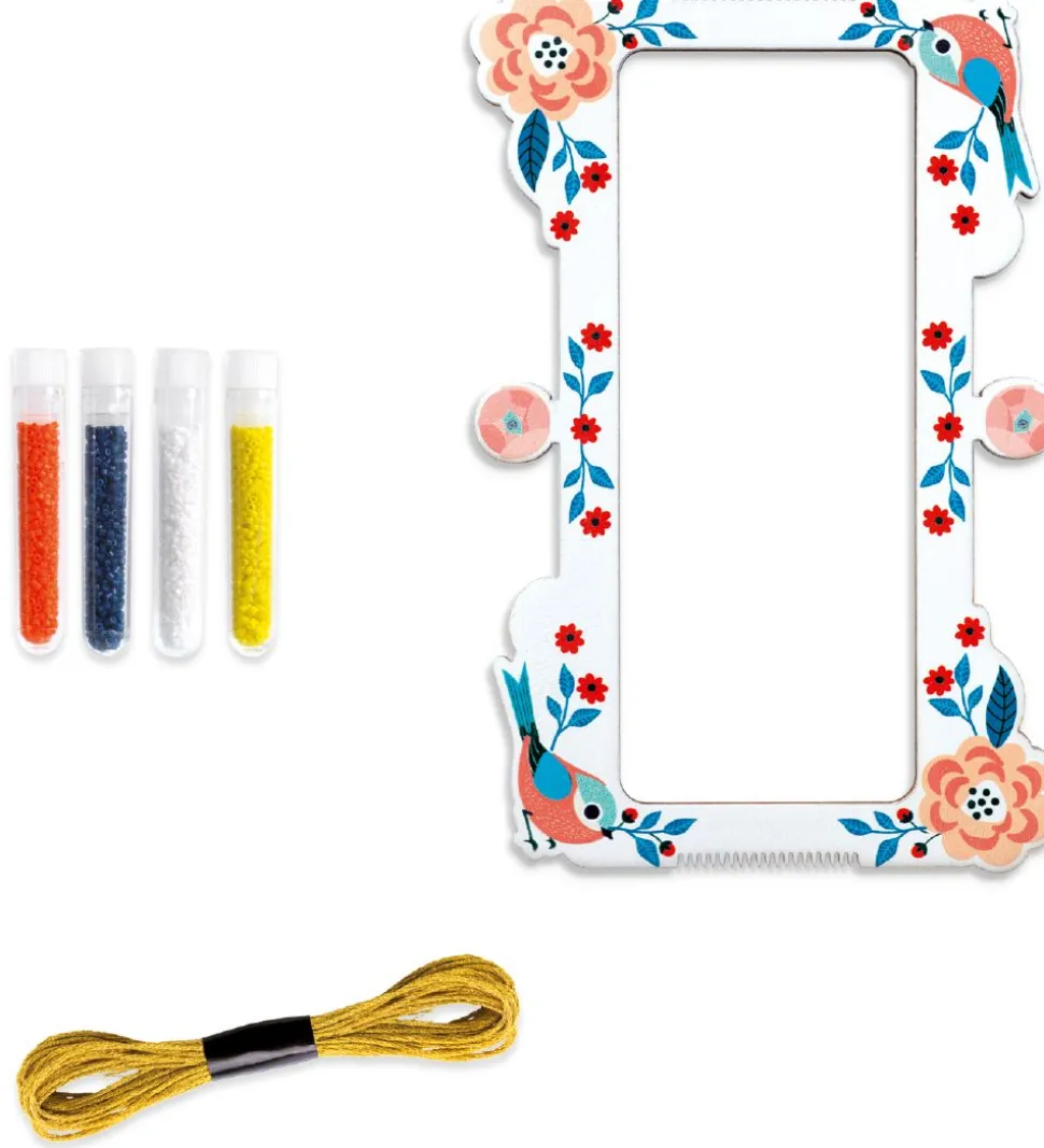 Skønt Djeco armbåndssæt bestående af 7 tuber med flotte perler i forskellige farver, to sæt guld tråd, en nål, en væv og en booklet med inspiration.