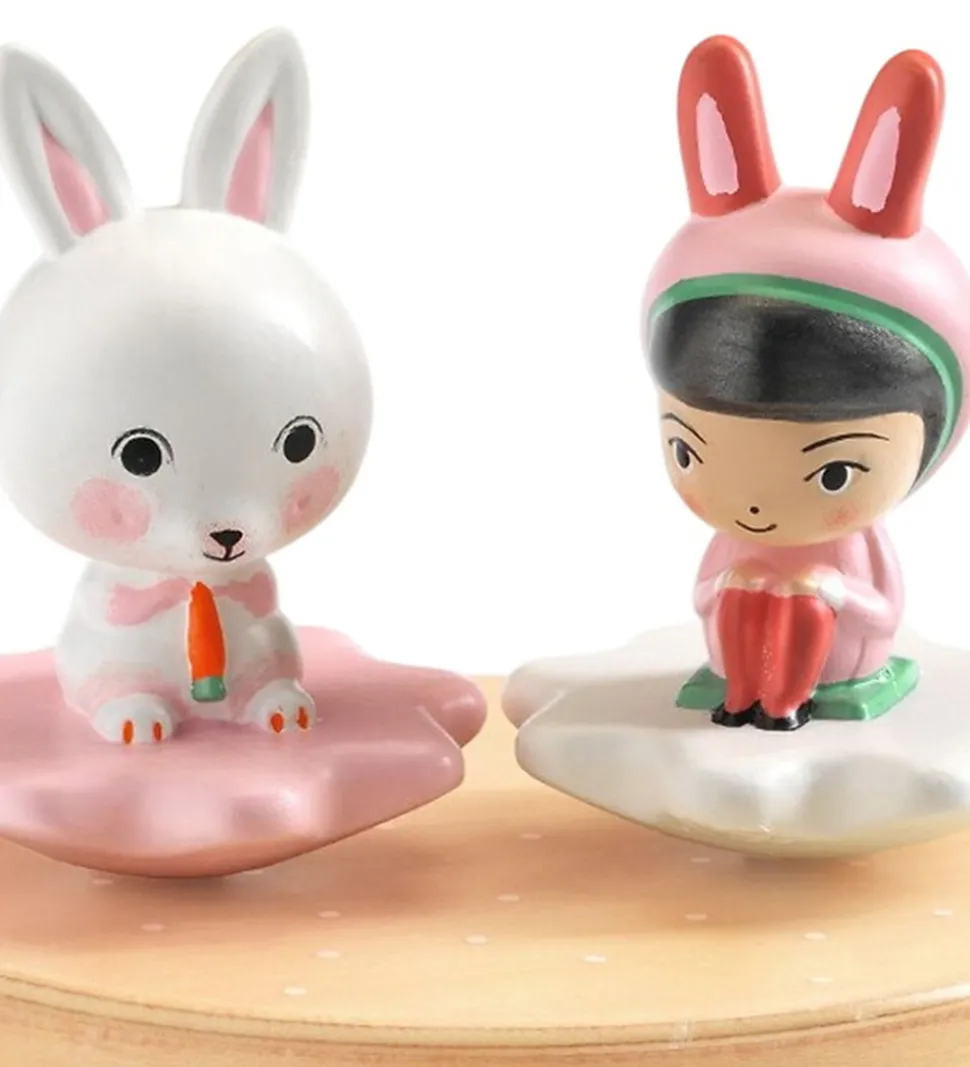 Djeco musikboksen har en rund form med korte røde ben. Ovenpå boksen er to magnetiske figurer, en kanin og en figur, begge siddende på en rosa og hvid platform og som vipper og drejer når musikken spilles. Musik boksen bliver trukket op på bagsiden og spiller en vuggevise af Schuberts.
