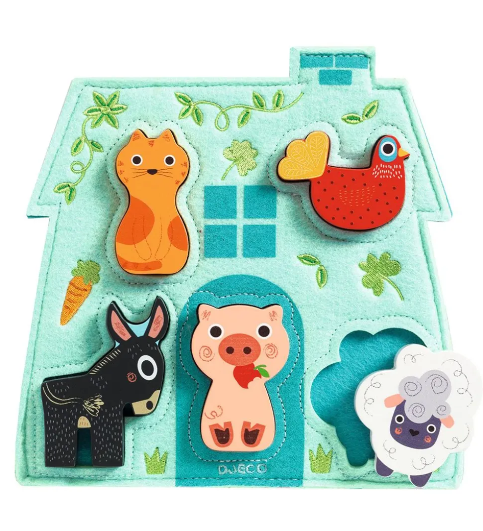 Flot Djeco puslespil i med en lyseblå filtplade samt fem brikker af søde dyr.