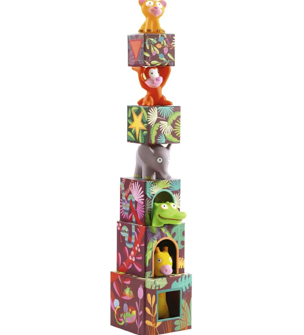 Djeco spillet går ud på at få stablet kasserne ovenpå hinanden efter størrelse. Undervejs kan man tale om de mange forskellige tal og dyr der er på kasserne. Indeholder 10 kasser. Inde i kasserne bor der sjove dyr som man også kan bruge til at stable videre.
