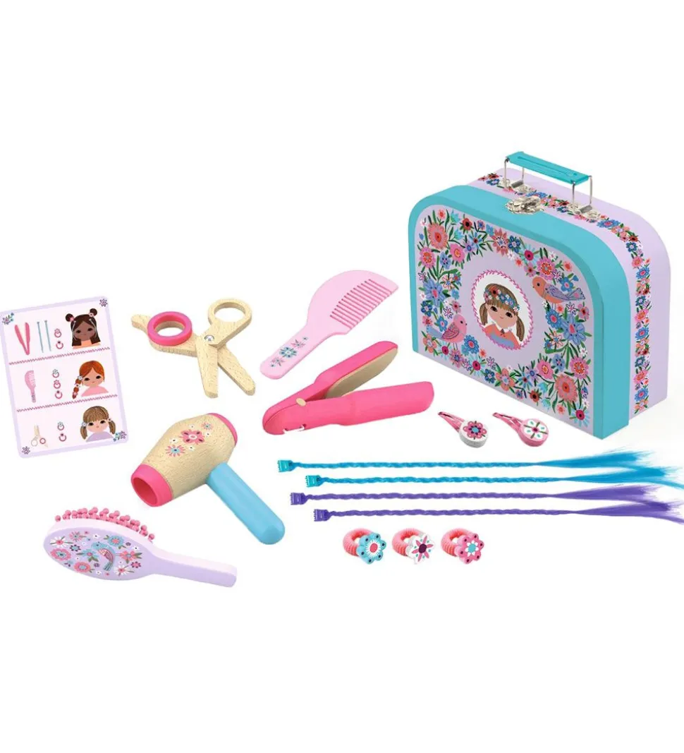 Djeco trælegetøjet indeholder alt du skal bruge til at lave flotte og seje hår styles. Hårpyntet kan sammensættes på mange forskellige måder, så barnet hver gang opnår et nyt resultat. Med den medfølgende inspirationsbog kan barnet nemt finde inspiration til hvordan, de kan sætte håret. Legetøjet er lavet i flot træ.