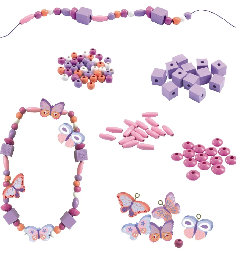 Djeco perlerne har forskellige former som er runde, firkantede og aflange. Æsken indeholder desuden 8 vedhæng, som er formet som fine sommerfugle. Der medfølger 6 meter rød tråd, så det er lige til at gå i gang med at lave fine smykker.