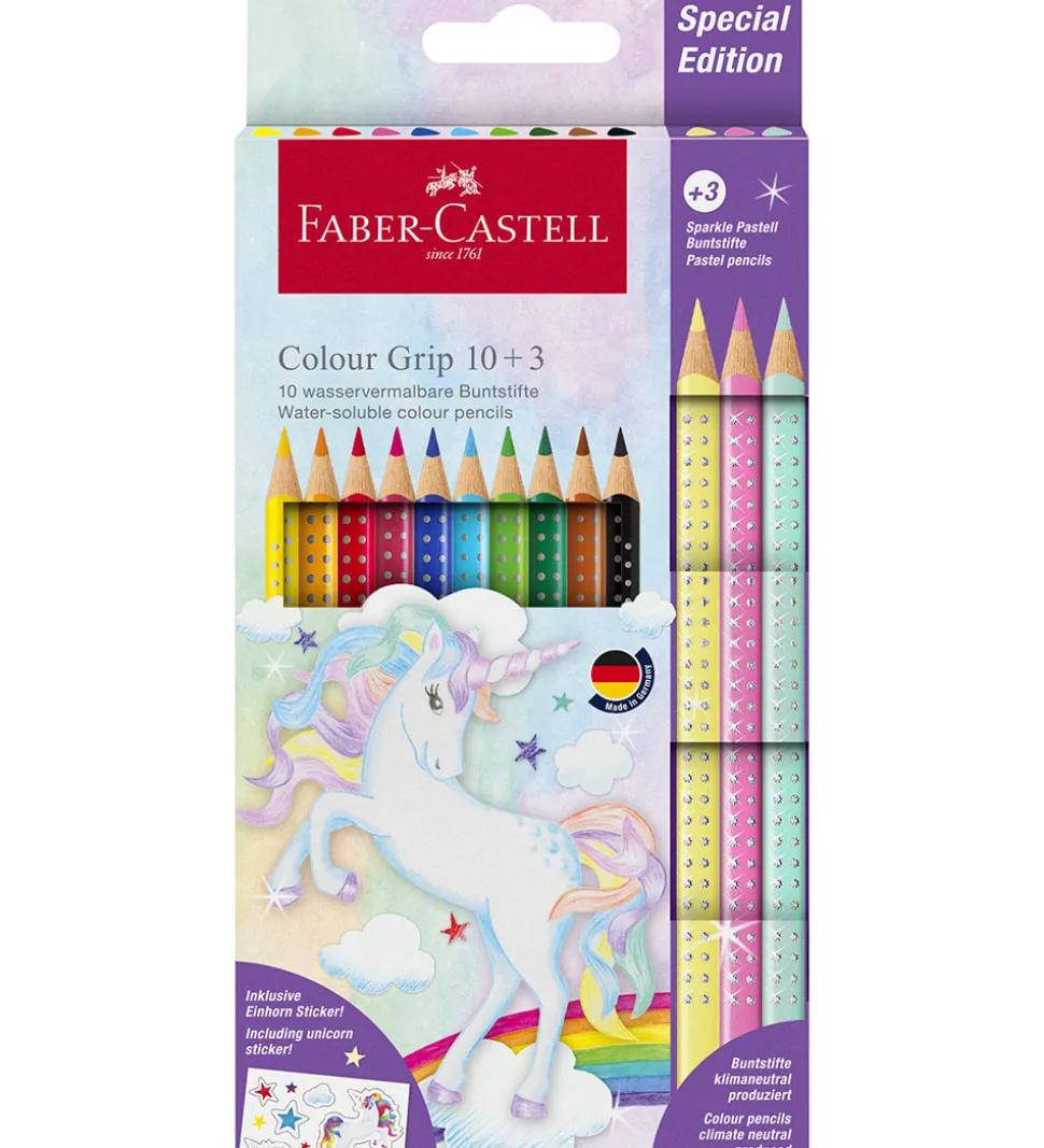 Fine Faber-Castell farveblyanter bestående af 10 farver + 3 pastelfarver. De medfølger også et klistermærkeark med enhjørninger.