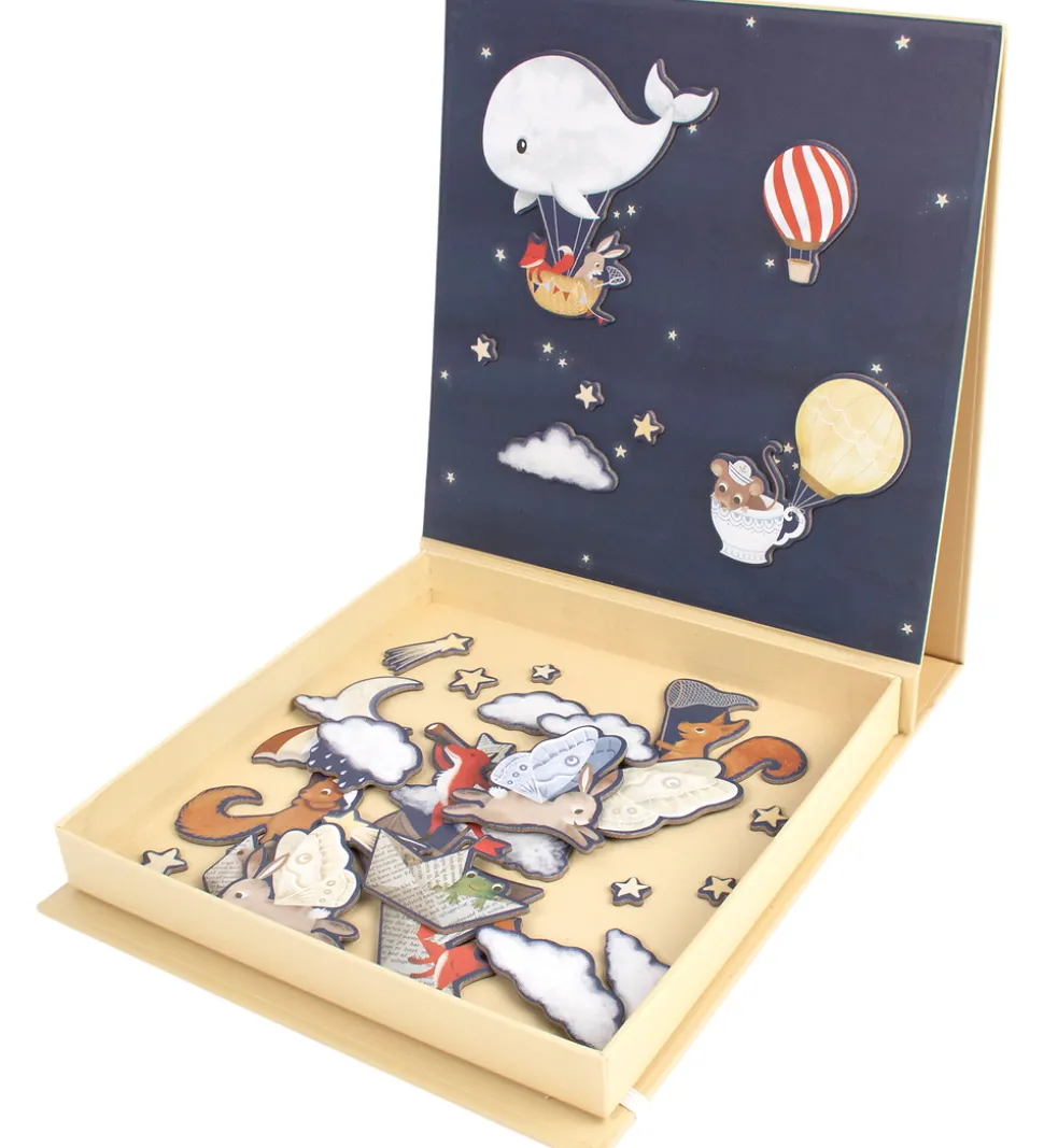 Hyggeligt Filibabba magnetlegetøj bestående af en gul æske med eventyrligt tema. Æsken indeholder 30 små magneter med motiver af bl.a. dyr, stjerner og luftballoner, som kan sættes på indersiden af æsken, og lave hyggelige billeder. Perfekt til fantasifuld leg og kreativ udfoldelse.