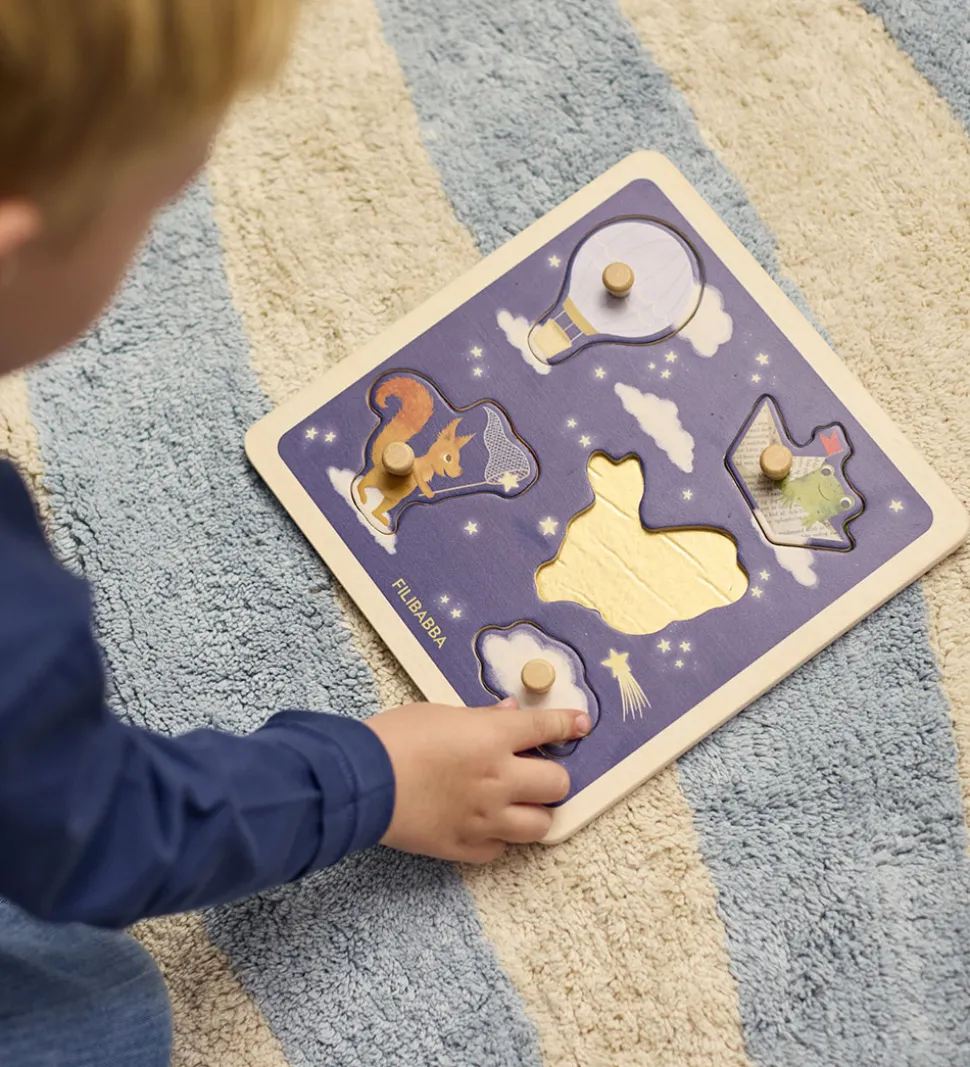 Hyggeligt Filibabba puslespil i mørkeblå med eventyrlige dyremotiver. Puslespillet er lavet af træ med 5 brikker og en knop på hver brik, så de er lette af rykke rundt. Bag hver brik er der stof, som matcher brikkens motiv, og som er sanselig at røre ved.