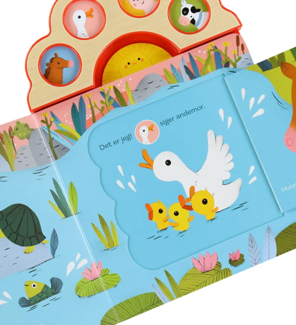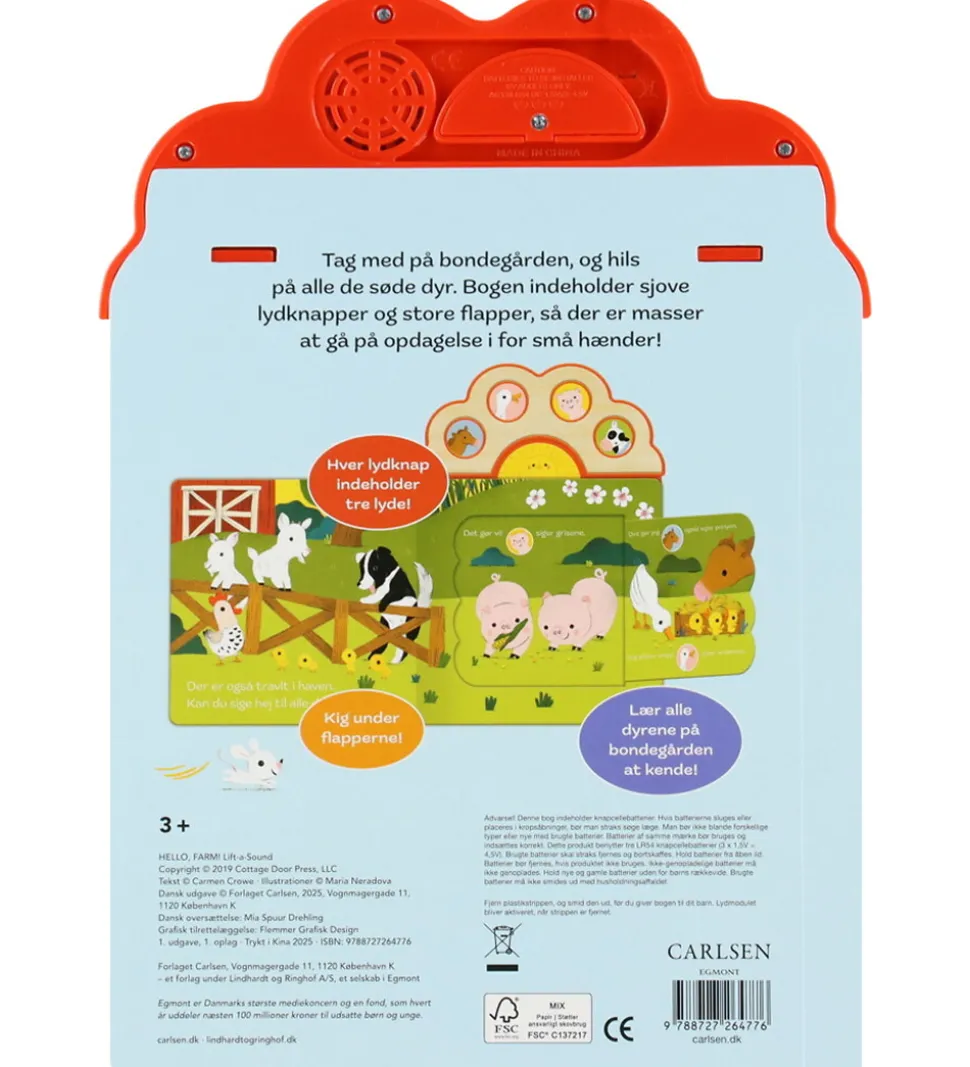 Underholdende Forlaget Carlsen bog med titlen “Bondegård med lyd”. Bogen handler om dyrene der hører til på bondegården. Bogen indeholder lydknapper og store flapper, som gør læseoplevelsen ekstra underholdene. Bogen har kratige sider.