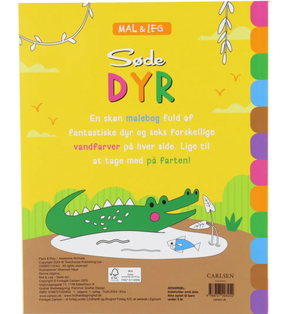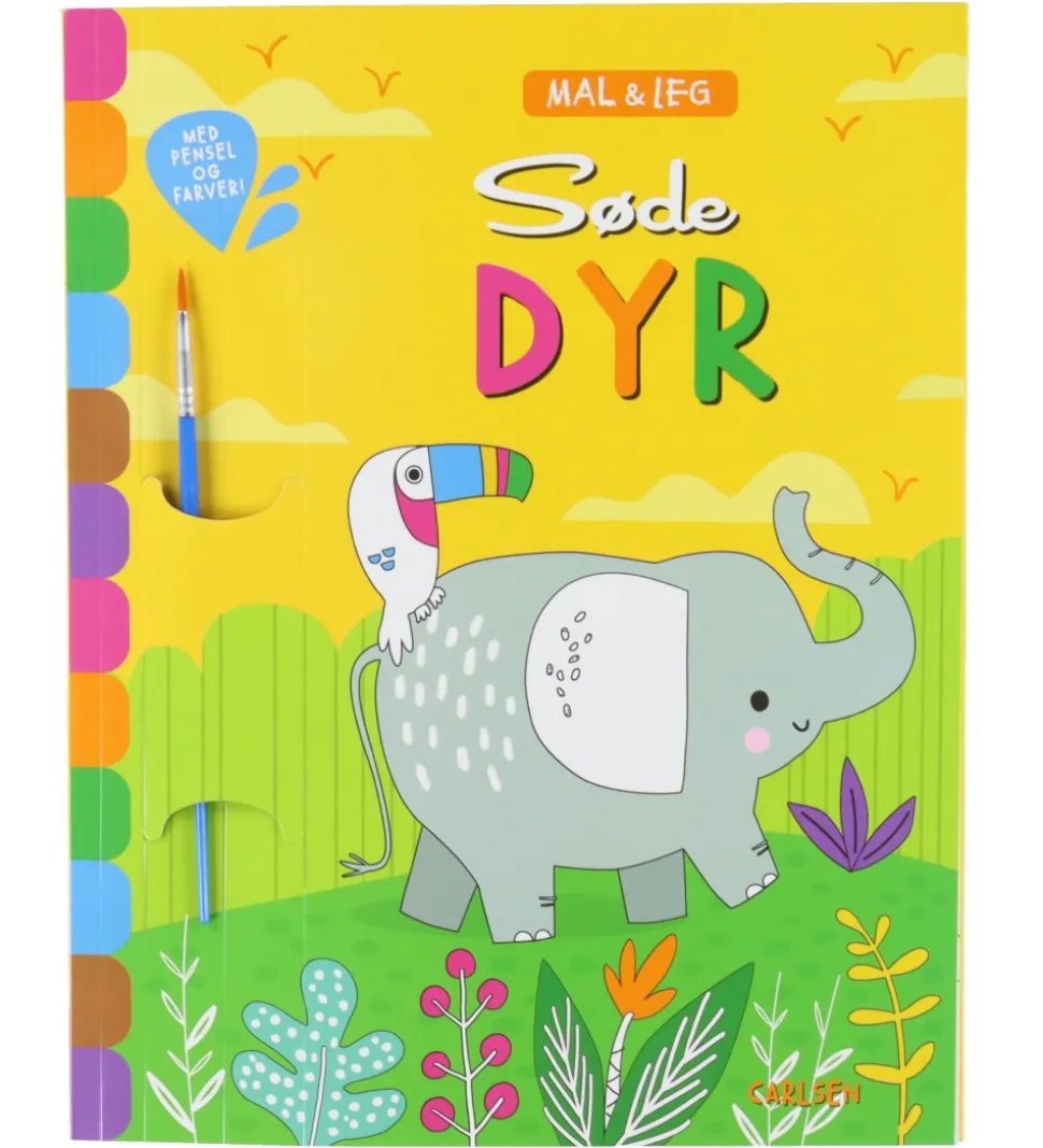 Malebogen indeholder motiver af søde dyr. Malebogen indeholder en pensel og seks vandfarver på hver side. Den er ideel til børn, der elsker at male og udfolde deres fantasi, og perfekt at have med på farten.