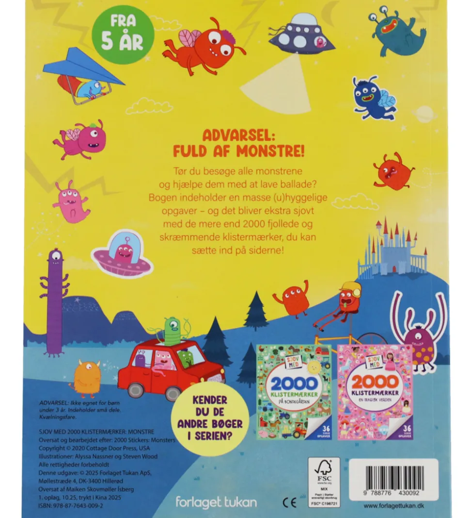 Farverig Forlaget Tukan aktivitetsbog med titlen “Sjov Med 2000 Klistermærker – Monstre”.