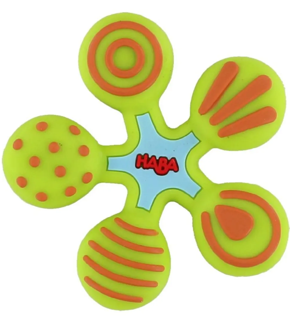 Praktisk Haba bidestjerne i grøn med orange bideområder med forskellige teksturer, som stimulerer gummerne og tænderne.