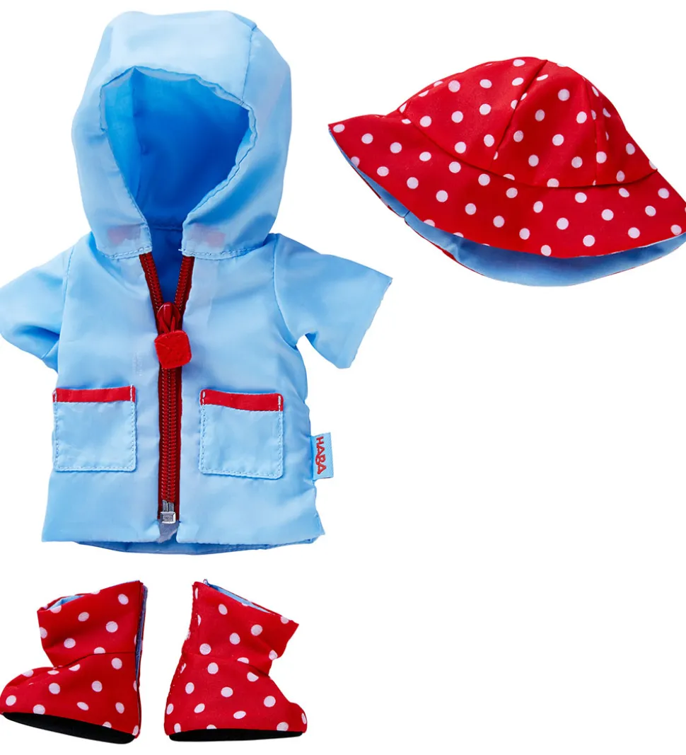 Charmerende HABA dukketøj bestående af en lyseblå regnfrakke, regnhat og sko i rød med hvide prikker. Kombinationen giver et sødt udtryk, der passer perfekt til dukkens garderobe. HABA sikrer kvalitet og stil.