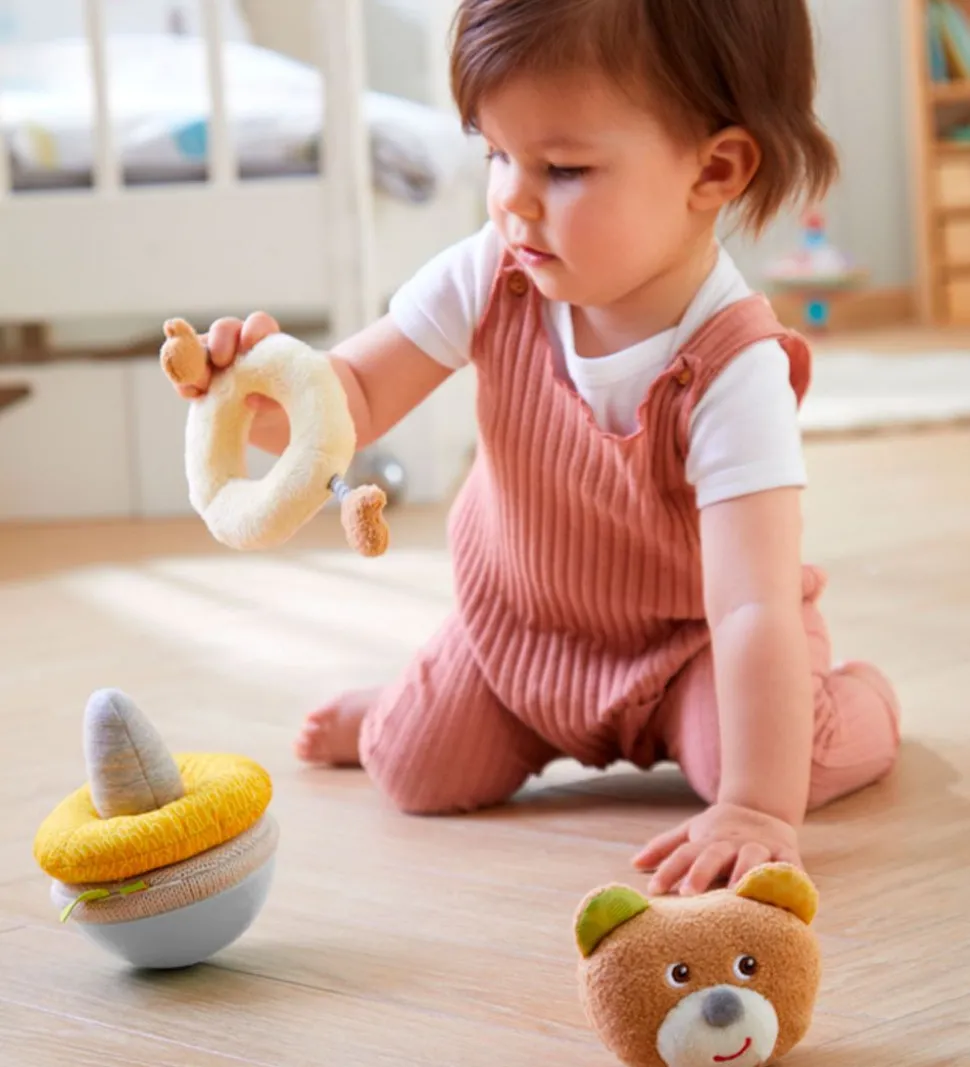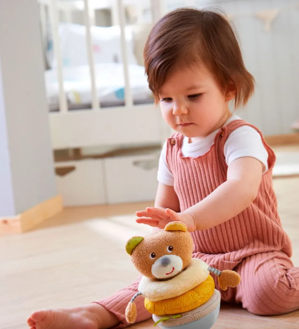 Smart Haba tumling i brune, gule, grønne og beige nuancer med form som en bjørn.