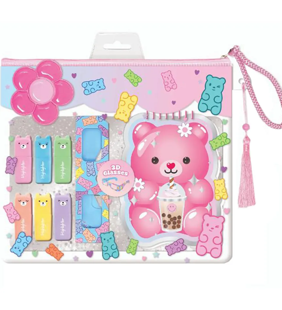 Sød Hot Focus notesbog med en sød lyserød bjørn og forskellige slikprints på omslaget. Notesbogen kommer med 6 highlightere og 3D-briller der gør at man kan se sine kreationer i 3D som man farvelægger i notesbogen. Sættet er sjovt for de små og inspirerer til kreativ udfoldelse.