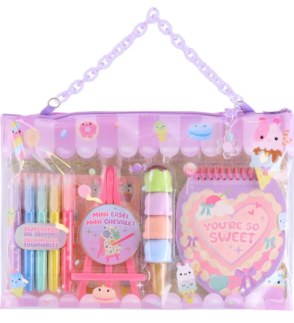 Flot Hot Focus taske, der inkluderer fem dobbeltsidede tuscher, et mini-staffeli, en stablebar overstregningstusch, et farvehæfte og et ark klistermærker. Perfekt til kreative projekter.