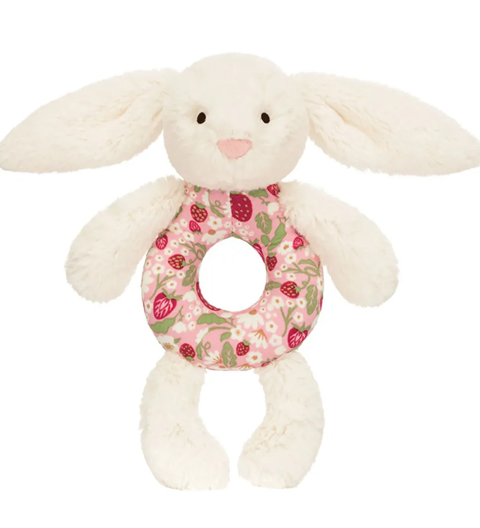 Sød Jellycat rangle med form som en kanin i hvid og med en blomstret krop.