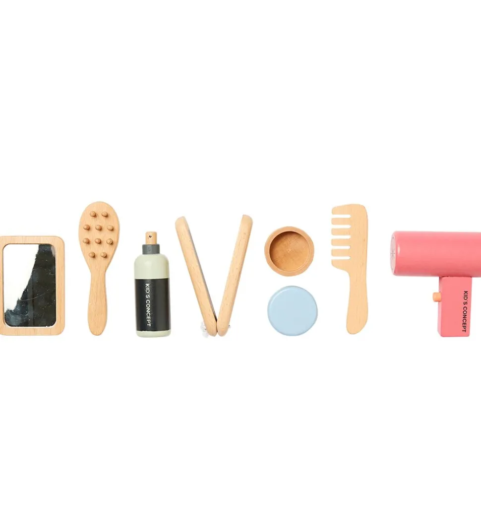 Kids Concept hårstylingssættet er super sjovt for børnene, som vil lege at de kan style hår ligesom ved frisøren eller som forældrene gør. Spraydåsen og hårtørreren har en lille knap, som kan klikkes ind.
