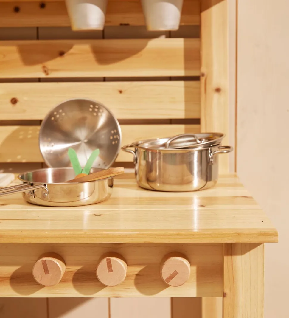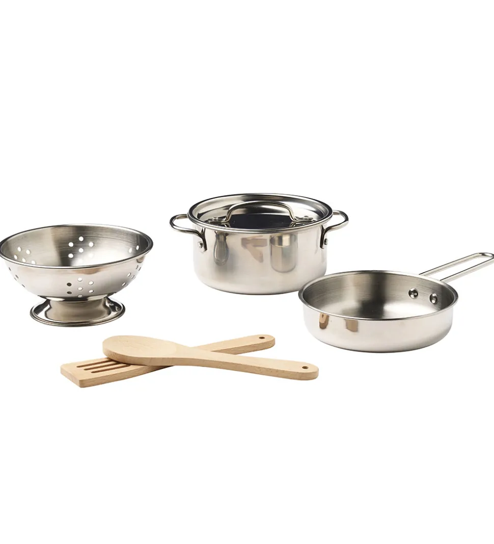 Kids Concept sættet er perfekt til den lille kok derhjemme og kan både bruges ude og inde. Gryde, pande og dørslag er i rustfri stål, mens grydeske og paletkniv er i træ. Gennem rolleleg stimuleres barnets fantasi, følelser, sprog- og sociale færdigheder.