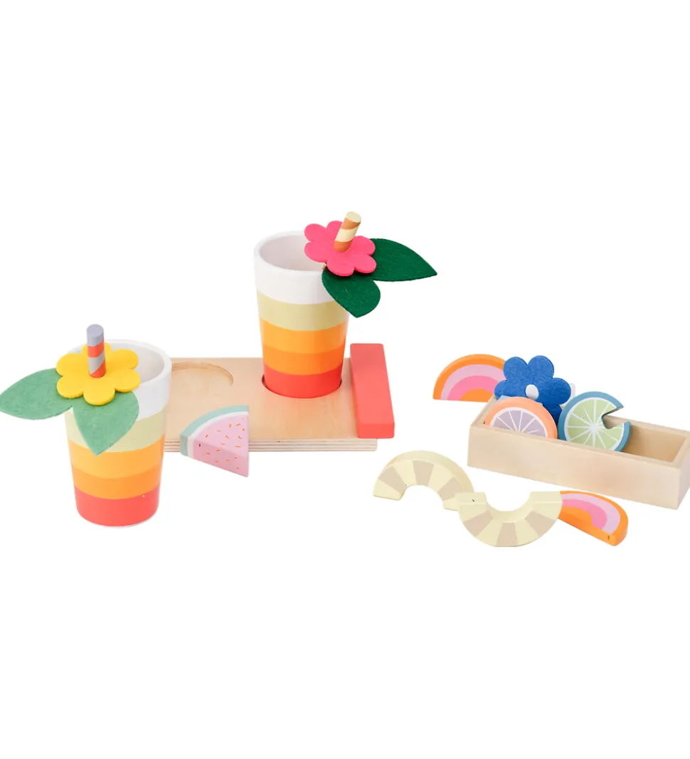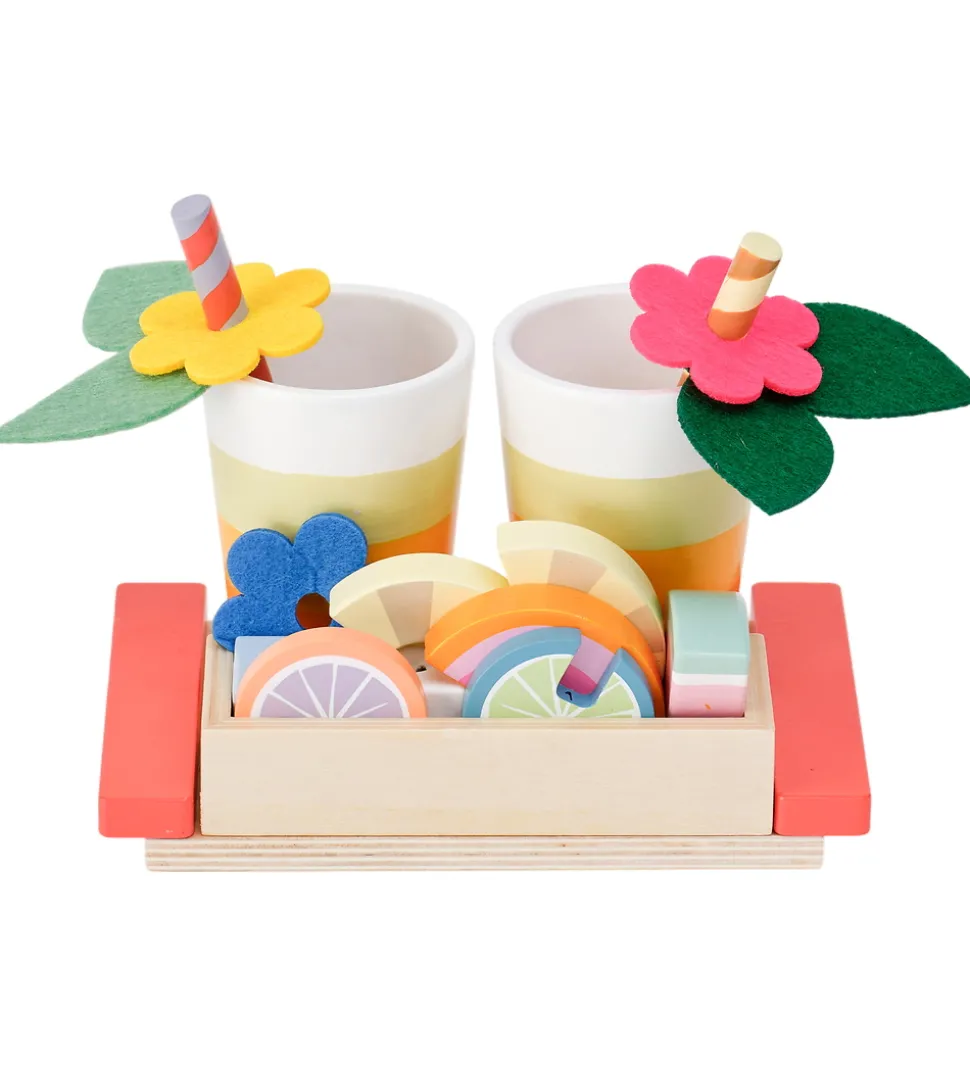KidsConcept legemaden består af en bakke med to kopper, og der medfølger en mase forskelligt pynt til at lave flotte drinks. Så er det lige til at servere for bamser og dukker, venner og familie.