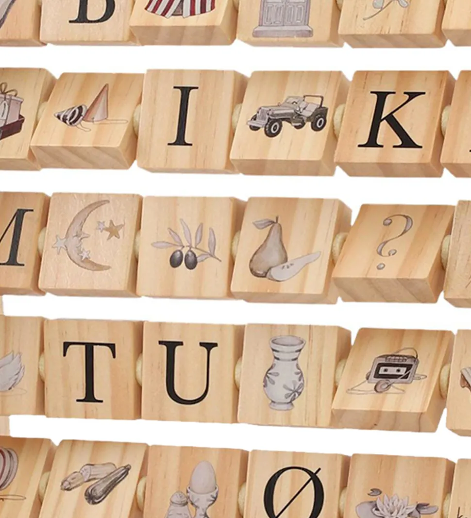 Konges Sløjd ABC blokrammen er lavet som en kugleramme og rummer hele alfabetet på den ene side og illutrationer på den anden, og de enkelte blokke kan drejes og kombineres på alle mulige forskellige måder for sjov leg og læring.