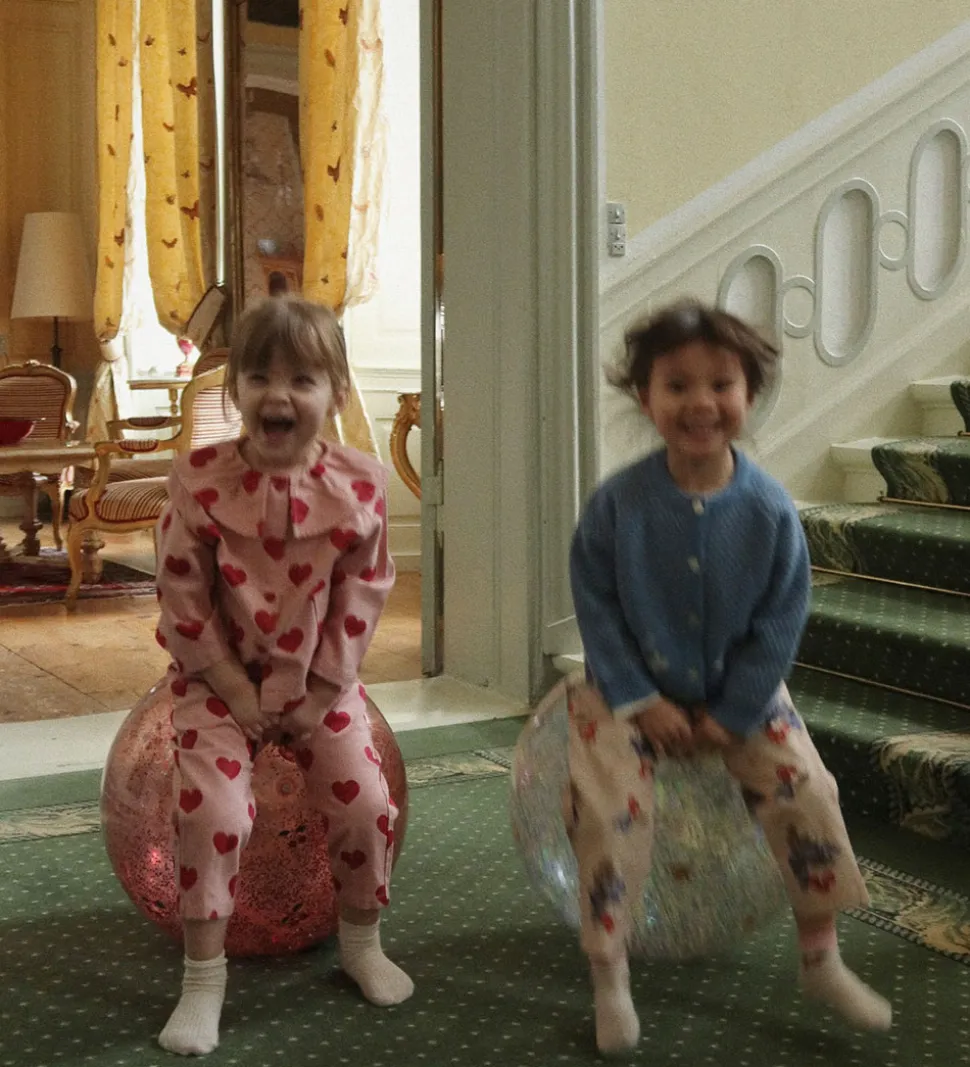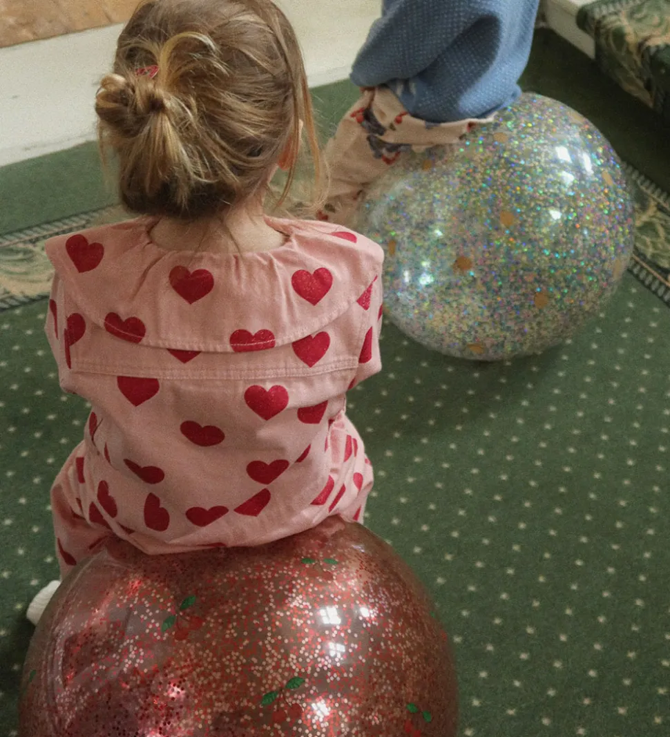 Fin Konges Sløjd hoppebold i rosa med metalliske prikker og små kirsebærprint.
