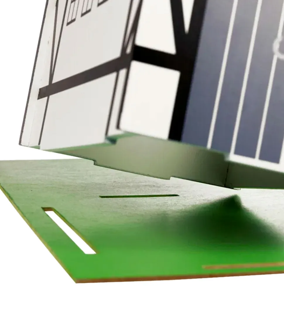 Krea bondegåden består af et hovedhus samt en lade og en stald, og i det ene hjørne er der en hyggelig indhegning til dyrene. Bygningerne kan sættes fast på pladen, så de ikke rutsjer rundt, og pladen kan foldes sammen, så den ikke fylder så meget. Tagene på bygningerne kan løftes af, så det er let at komme til at lege med bondegårdsdyr og dukker indeni bygningerne.