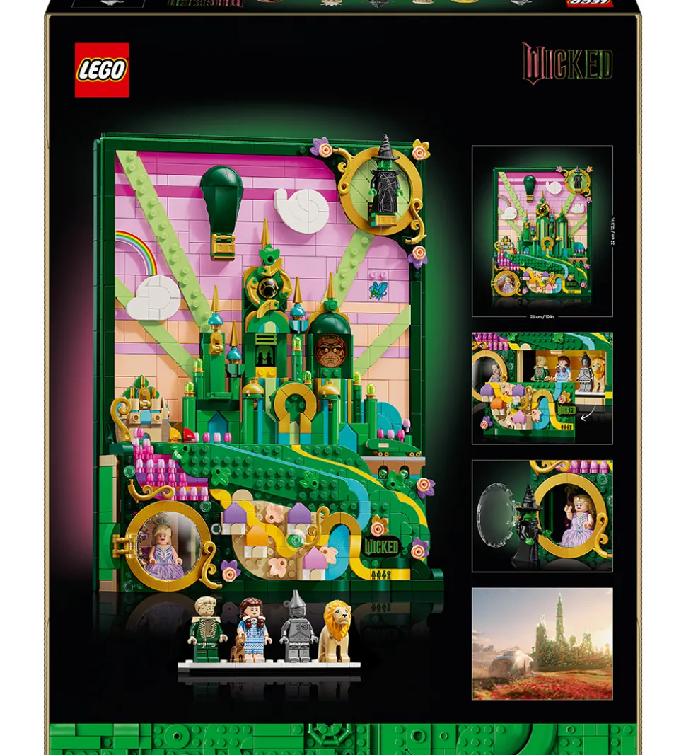 LEGO® Wicked sættet er designet som en dekorativ vægmodel med en storby-scene i grønne og gyldne nuancer. De mange små detaljer giver et imponerende resultat, og med de medfølgende figurer kan man skabe en komplet fremstilling af universet omkring Emerald City.