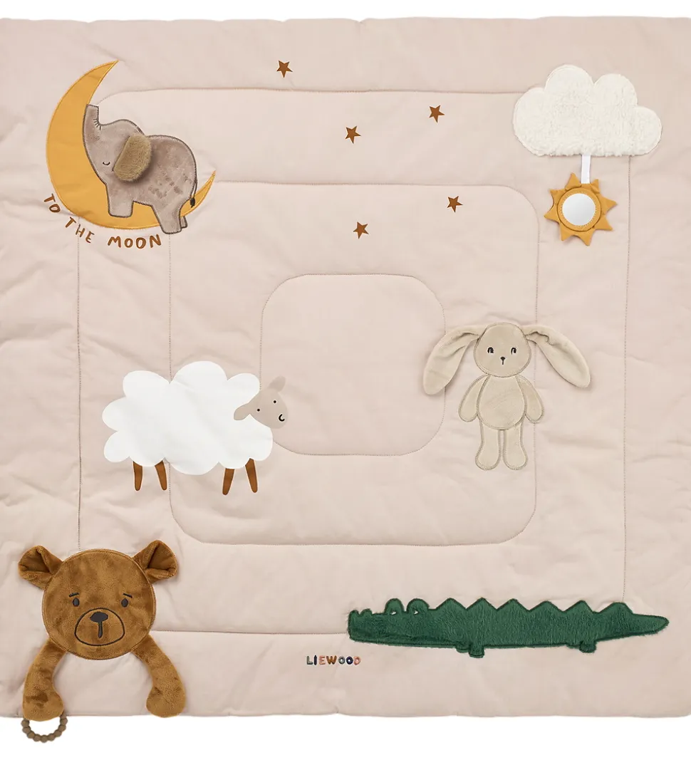 Charmerende Liewood aktivitetstæppe i en varm beige og er dekoreret med søde motiver af en elefant, får, kanin, bjørn og krokodille.