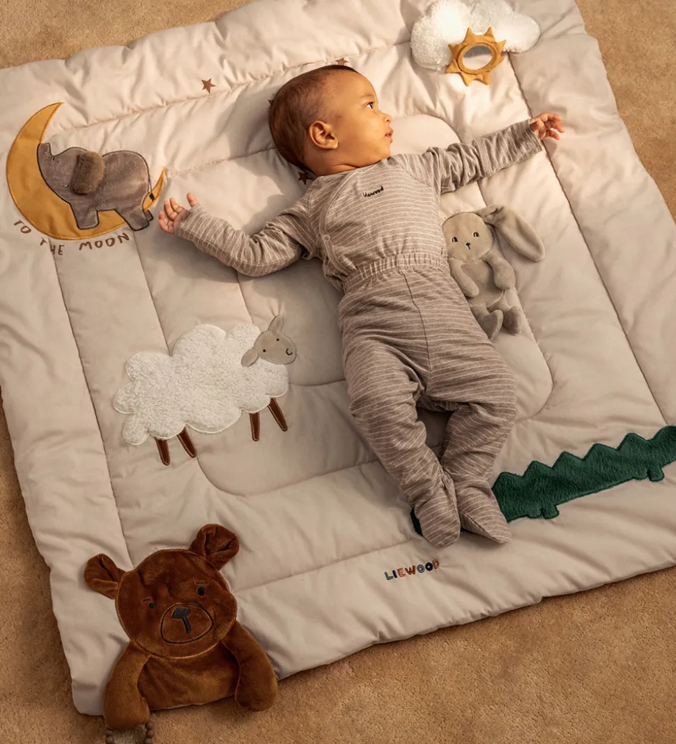 Liewood aktivitetstæppet har en firkantet form og er blød og vatteret, så barnet ligger behagelig og lunt. Aktivitetstæppet byder på flere teksturer og aktiviteter, som stimulerer de motoriske og visuelle færdigheder. På selve tæppet er der fastgjort flere nulreflapper i form af motiverne, nogle som også knitrer når baby rører ved dem.
