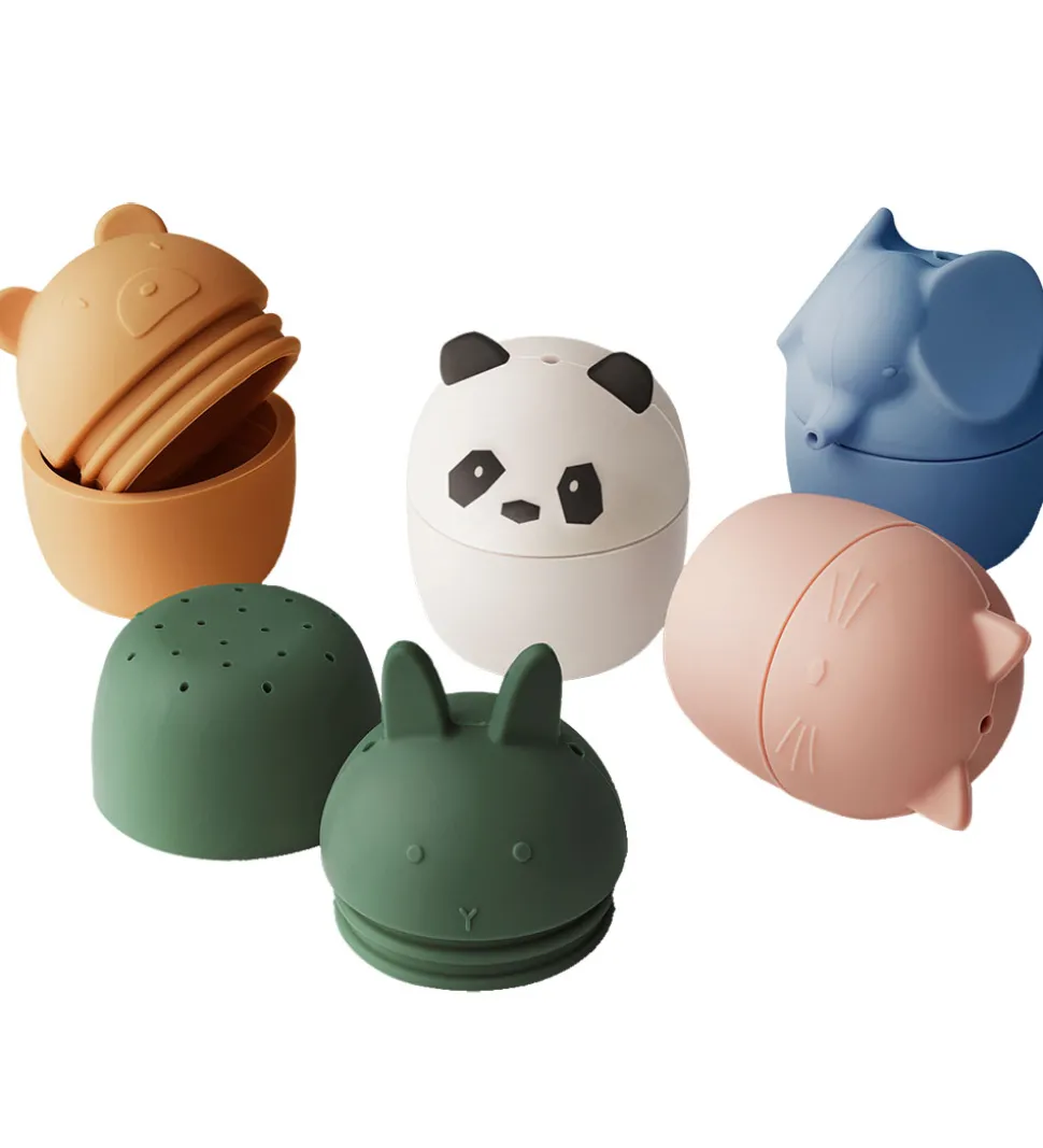 Liewood badelegetøjet er i silikone og har huller i bunden og i toppen. Alle fem dyr er i to dele, som kan tages fra hinanden for at gøre rengøringen let. De gør badet lidt sjovere.