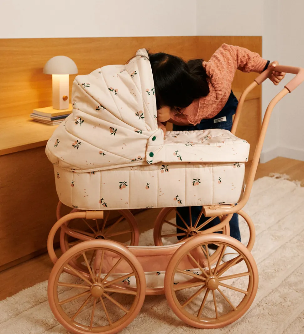 Fin Liewood dukkevogn i hvid med et allover print af ferskner. Stoffet har en quiltet struktur.