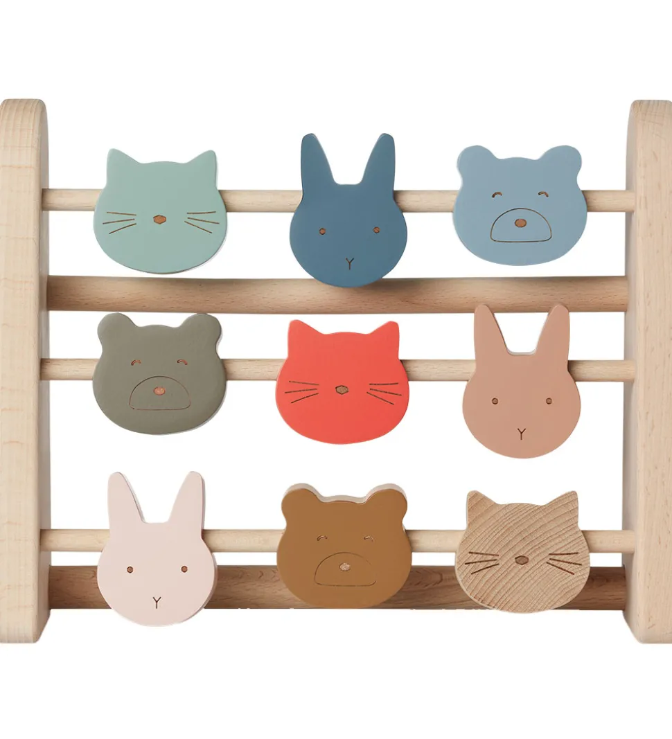 Sjov Liewood kugleramme i naturlig træ med trækugler, der består af søde, udskårne dyrehoveder af malet træ i forskellige farver.
