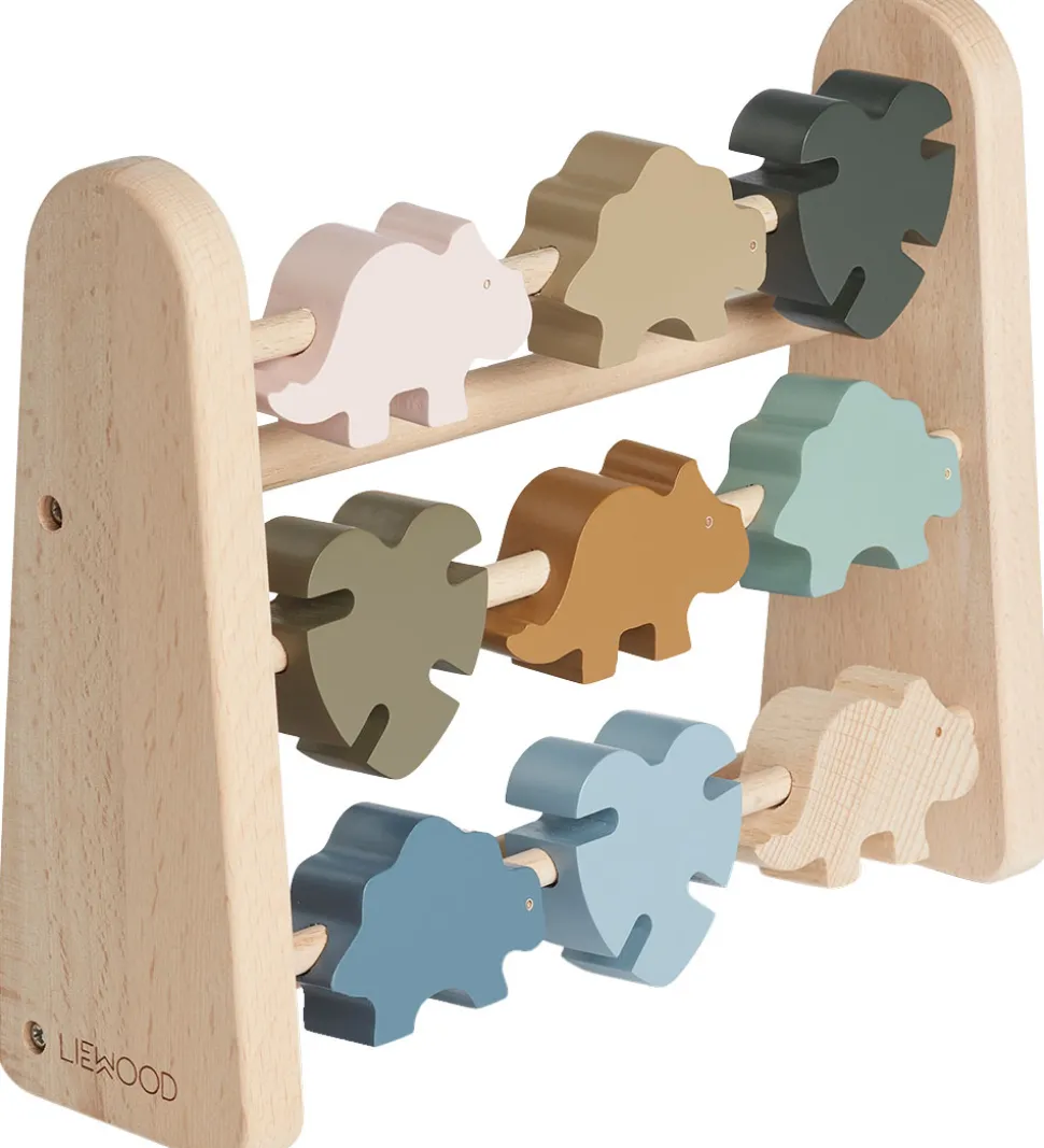 Sjov Liewood kugleramme i naturlig træ med trækugler, der består af søde, udskårne dinoer og blade af malet træ i forskellige farver.