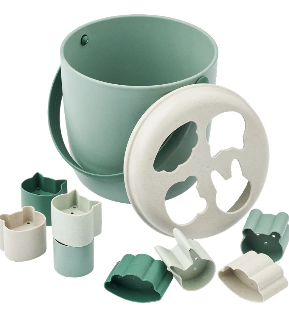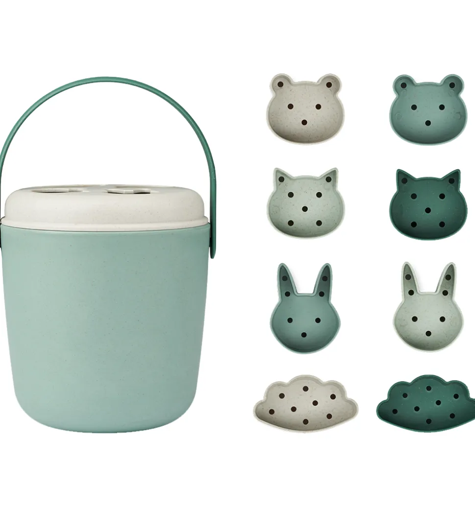 - 8 sandforme med forskellige facon i grønne og grå nuancer og med si-huller