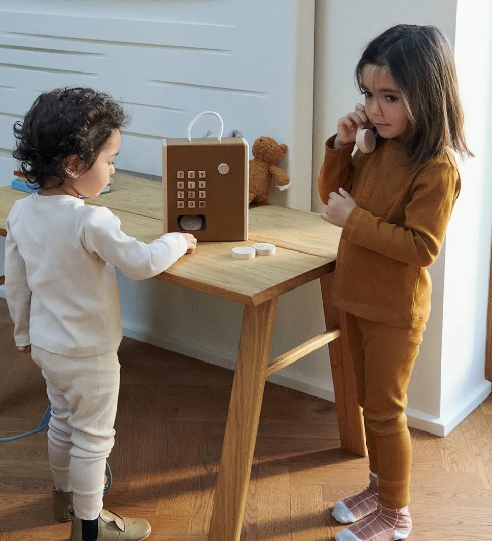 Liewood trælegetøjet er sjovt for de små og der medfølger fire mønter. Telefonen har trykbare knapper, håndtaget kan løftes og lægges på igen, og mønter kan kastes ind øverst og returneres i bunden.