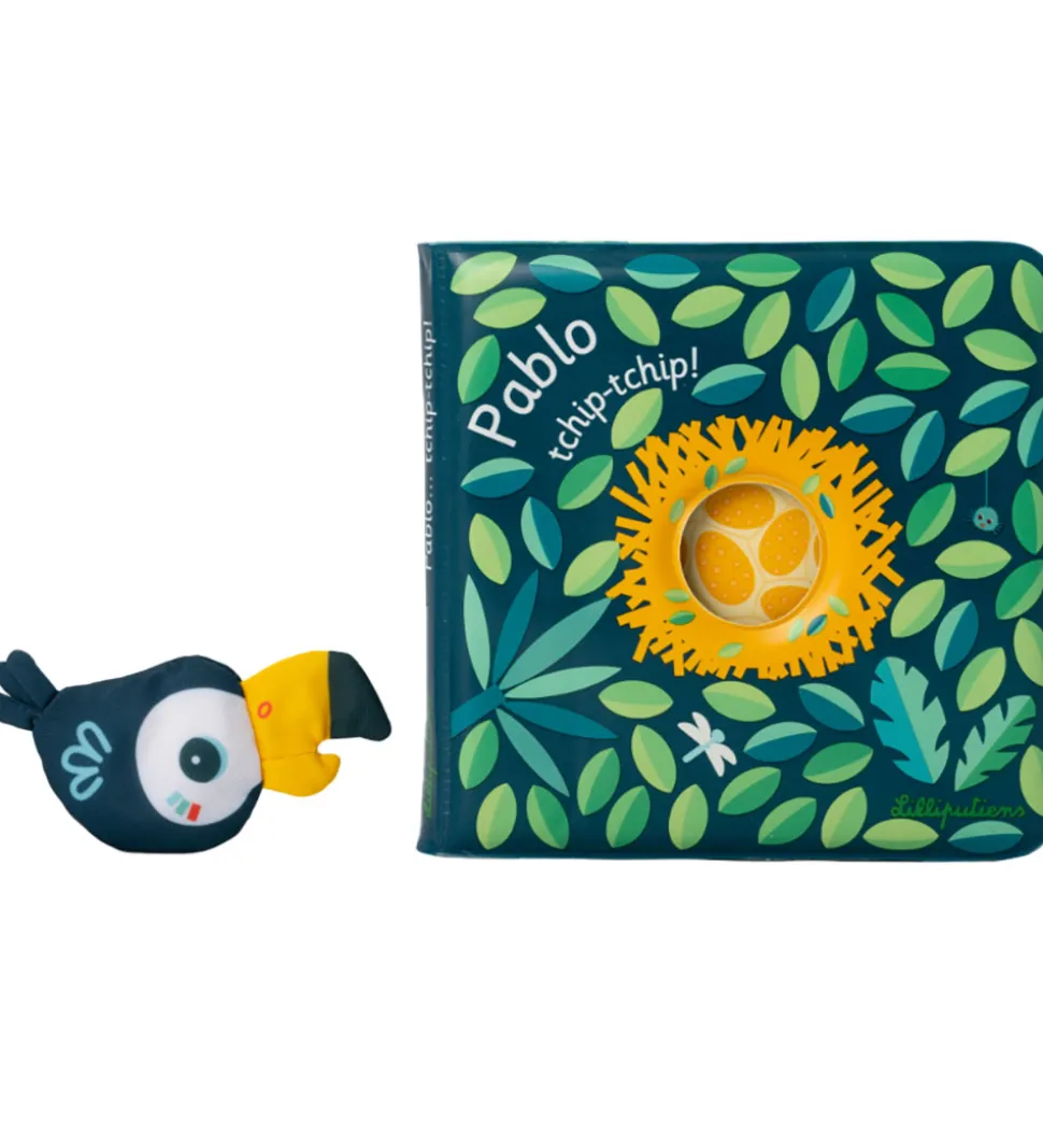 Lilliputiens badebogen er i et vandtæt materiale og fuld af sjove detaljer, der kan leges med i badet. Pablo kan stikke sit hoved ud gennem forsiden, og badebogens illustrationer ændrer sig på magisk vis, når de kommer i kontakt med vand, der er varmere end 32 grader.