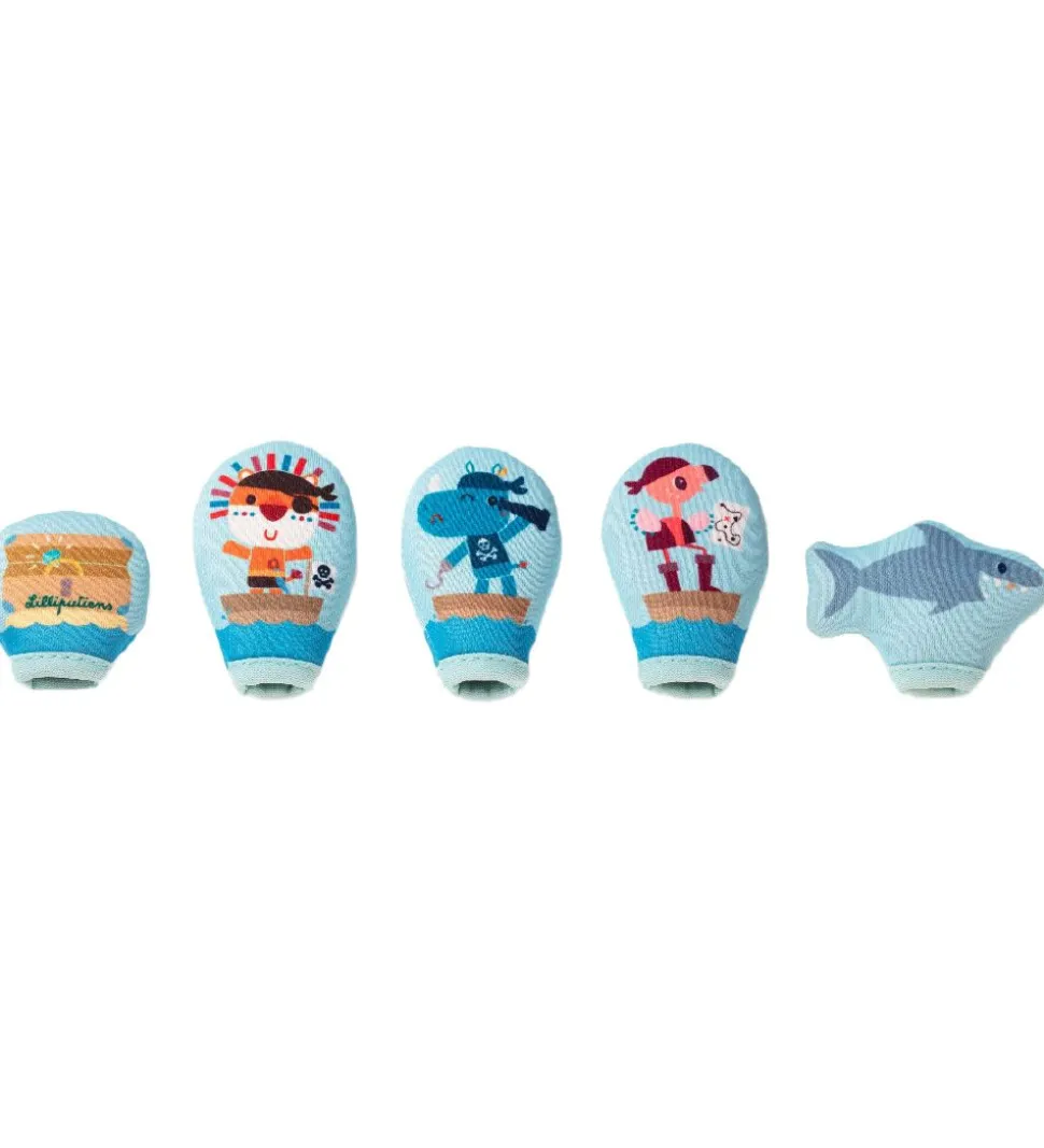 Underholdende Lilliputiens badefingerdukker består af 5 dele i blå af en haj, en skat og tre sjove pirater i forskellige farver.