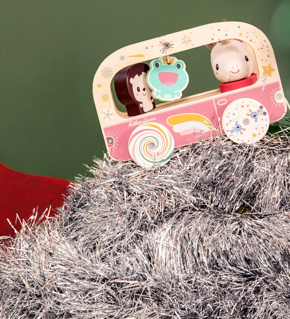 Sjovt træklegetøj fra Lilliputiens formet som en bus i træ med farverigt og eventyrligt print. I bussen sidder enhjørningen Lena og et lille brunt dyr. Enhjørningen er blød og kan tages ud af bussen mens det brune dyr er lavet af træ, og drejer rundt når bussen kører. Bussen er udstyret med en frø, som hænger i midten og fire hjul med billeder på siderne, som skaber en optisk illusion når de drejer rundt. Bussen trækkes med en snor foran.