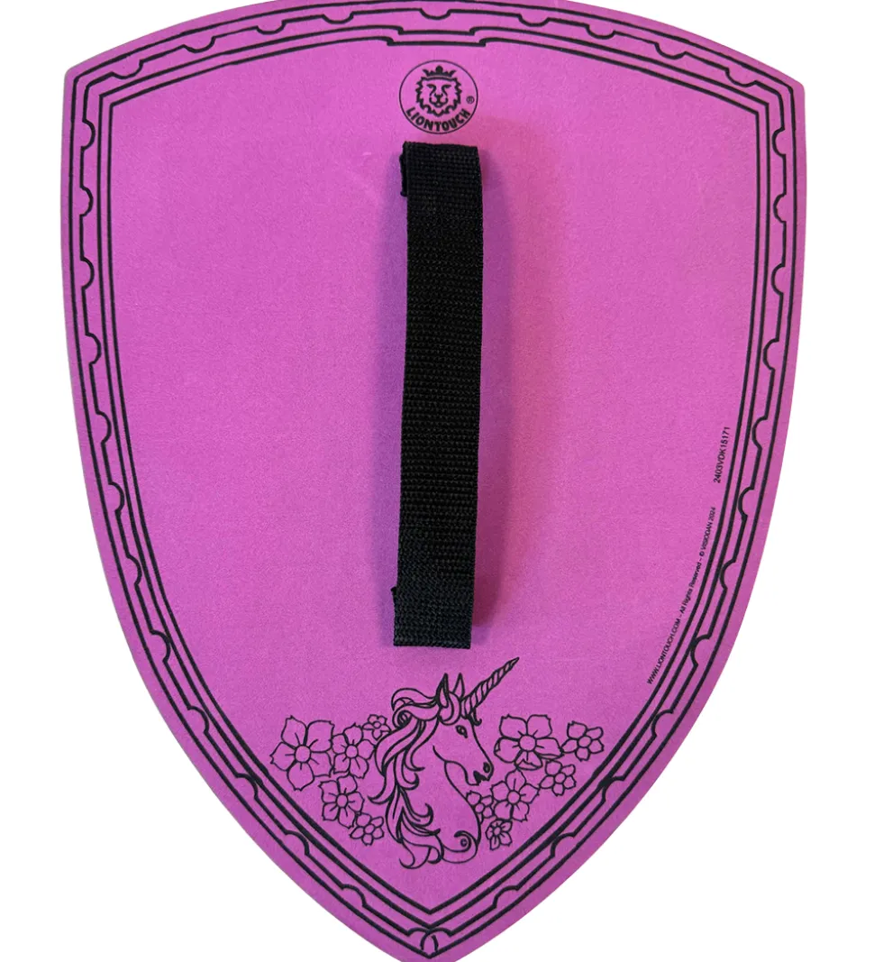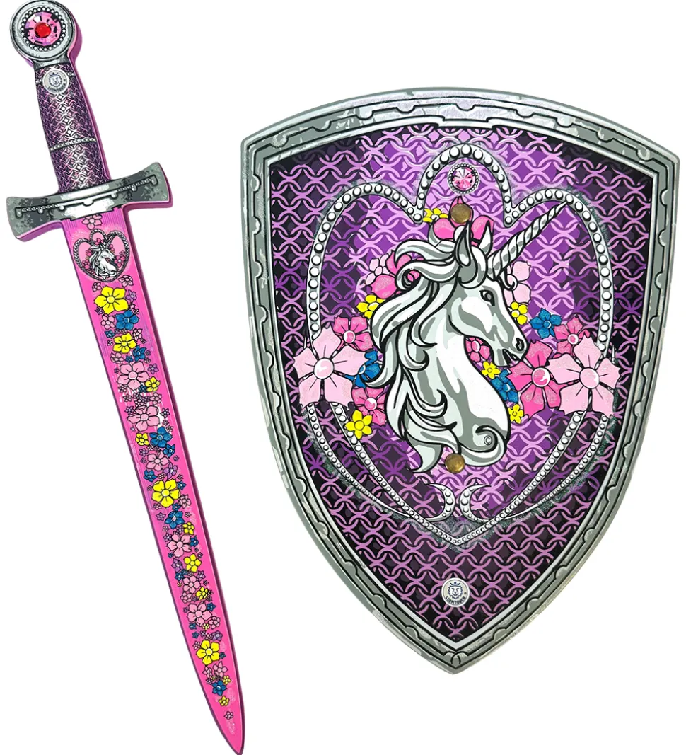 Flot Liontouch udklædningstilbehør i form af et sværd og et skjold i lilla og pink, med et flot print og glimmer detaljer.